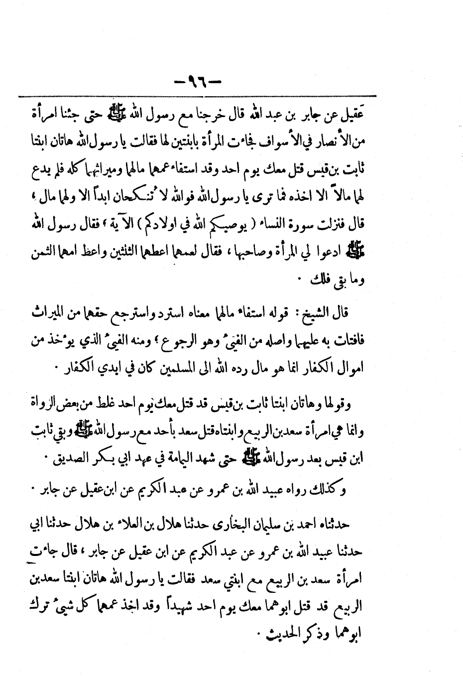 حدثناه أحمد بن سليمان البخاري حدثنا هلال بن العلاء بن هلال حدثنا أبي حدثنا عبيد الله بن عمرو عن عبد الكريم عن ابن عقيل عن جابر، قال جاءت امرأة سعد بن الربيع مع ابنتي سعد فقالت يا رسول الله هاتان ابنتا سعد بن الربيع قد قتل أبوهما معك يوم أحد شهيداً وقد أخذ عمهما كل شيء ترك أبوهما وذكر الحديث.