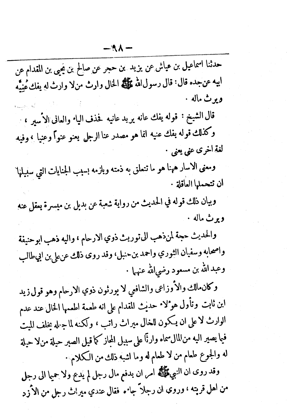 حدثنا إسماعيل بن عياش عن يزيد بن حجر عن صالح بن يحيى بن المقدام عن أبيه عن جده قال: قال رسول الله صلى الله عليه وسلم الخال وارث من لا وارث له يفك عُنِيَّه ويرث ماله.