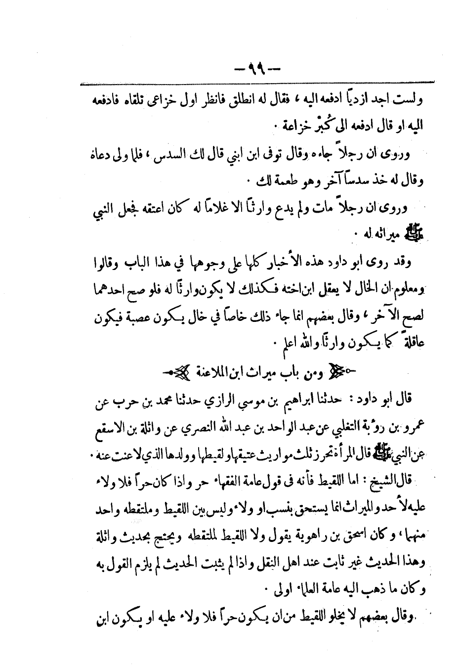 قال أبو داود: حدثنا إبراهيم بن موسى الرازي حدثنا محمد بن حرب عن عمرو بن رؤبة التغلبي عن عبد الواحد بن عبد الله النصري عن واثلة بن الأسقع عن النبي صلى الله عليه وسلم قال المرأة تحرز ثلث مواريث عتيقها ولقيطها وولدها الذي لاعنت عنه.