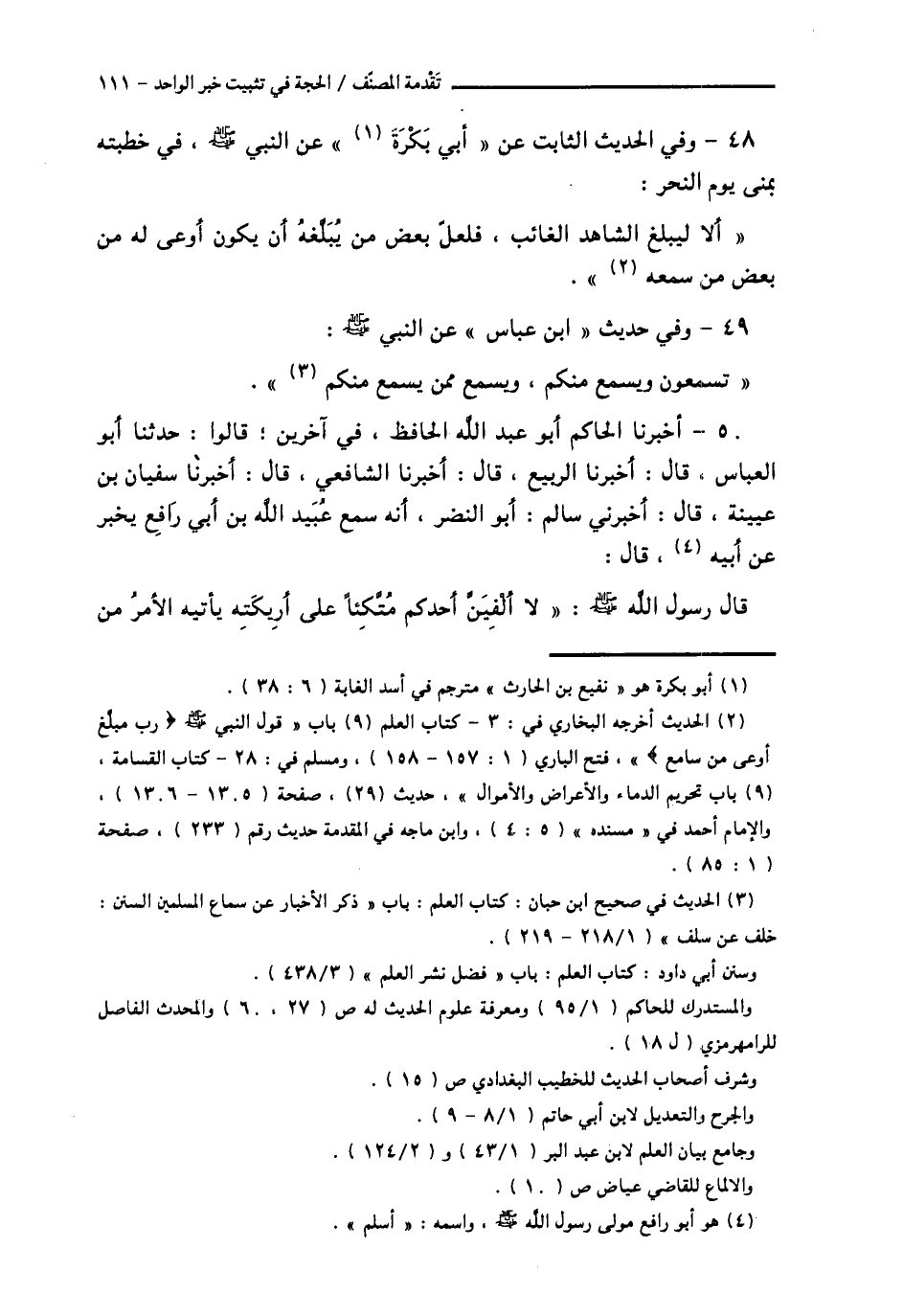 50 - أَخْبَرَنَا الْحَاكِمُ أَبُو عَبْدِ اللَّهِ الْحَافِظُ فِي آخَرِينَ قَالُوا: حَدَّثَنَا أَبُو الْعَبَّاسِ قَالَ: أَخْبَرَنَا الرَّبِيعُ قَالَ: أَخْبَرَنَا الشَّافِعِيُّ، قَالَ: أَخْبَرَنَا سُفْيَانُ بْنُ عُيَيْنَةَ قَالَ: أَخْبَرَنِي سَالِمٌ أَبُو النَّضْرِ، أَنَّهُ سَمِعَ عُبَيْدَ اللَّهِ بْنَ أَبِي رَافِعٍ يُخْبِرُ عَنْ أَبِيهِ قَالَ: قَالَ رَسُولُ اللَّهِ صَلَّى اللهُ عَلَيْهِ وَسَلَّمَ: §" لَا أَلْفِيَنَّ أَحَدَكُمْ مُتَّكِئًا عَلَى أَرِيكَتِهِ يَأْتِيهِ الْأَمْرُ مِنْ -[112]- أَمْرِي مِمَّا أَمَرْتُ بِهِ أَوْ نَهَيْتُ عَنْهُ فَيَقُولُ: لَا أَدْرِي، مَا وَجَدْنَا فِي كِتَابِ اللَّهِ اتَّبَعْنَاهُ "