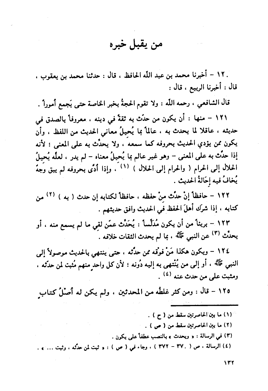 127 - قَالَ الشَّيْخُ أَحْمَدُ: الْأَمْرُ فِي شَرْطِ مَنْ يُقْبَلُ خَبَرُهُ عِنْدَ كَافَّةِ أَهْلِ الْعِلْمِ بِالْحَدِيثِ عَلَى مَعْنَى مَا ذَكَرَهُ الشَّافِعِيُّ رَحِمَهُ اللَّهُ،