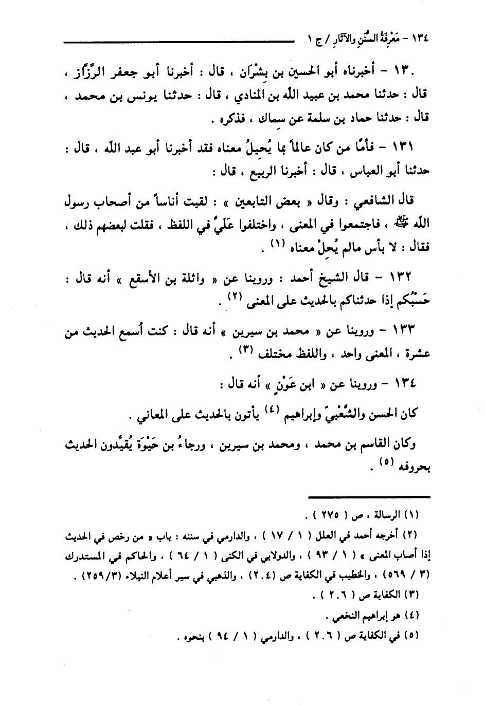 134 - وَرُوِّينَا عَنِ ابْنِ عَوْنٍ أَنَّهُ قَالَ: كَانَ الْحَسَنُ، وَالشَّعْبِيُّ، وَإِبْرَاهِيمُ يَأْتُونَ بِالْحَدِيثِ عَلَى الْمَعَانِي، وَكَانَ الْقَاسِمُ بْنُ مُحَمَّدٍ، وَمُحَمَّدُ بْنُ سِيرِينَ، وَرَجَاءُ بْنُ حَيْوَةَ يُقَيِّدُونَ الْحَدِيثَ بِحُرُوفِهِ.