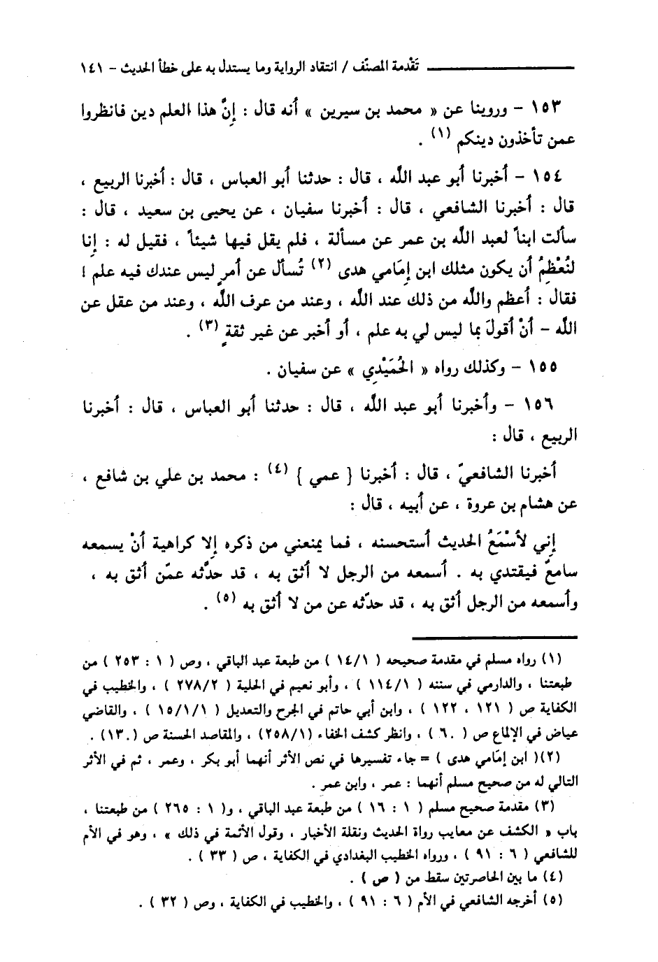 156 - وَأَخْبَرَنَا أَبُو عَبْدِ اللَّهِ قَالَ: حَدَّثَنَا أَبُو الْعَبَّاسِ، قَالَ: أَخْبَرَنَا الرَّبِيعُ، قَالَ: أَخْبَرَنَا الشَّافِعِيُّ، قَالَ: أَخْبَرَنَا عَمِّي مُحَمَّدِ بْنِ عَلِيِّ بْنِ شَافِعٍ، عَنْ هِشَامِ بْنِ عُرْوَةَ، عَنْ أَبِيهِ، قَالَ: §إِنِّي لَأَسْمَعُ الْحَدِيثَ أَسْتَحْسِنُهُ فَمَا يَمْنَعُنِي مِنْ ذِكْرِهِ إِلَّا كَرَاهِيَةُ أَنْ يَسْمَعَهُ سَامِعٌ فَيَقْتَدِيَ بِهِ، أَسْمَعُهُ مِنَ الرَّجُلِ لَا أَثِقُ بِهِ قَدْ حَدَّثَهُ عَمَّنْ أَثِقُ بِهِ، وَأَسْمَعُهُ مِنَ الرَّجُلِ أَثِقُ بِهِ قَدْ حَدَّثَهُ عَمَّنْ لَا أَثِقُ بِهِ -[142]-.