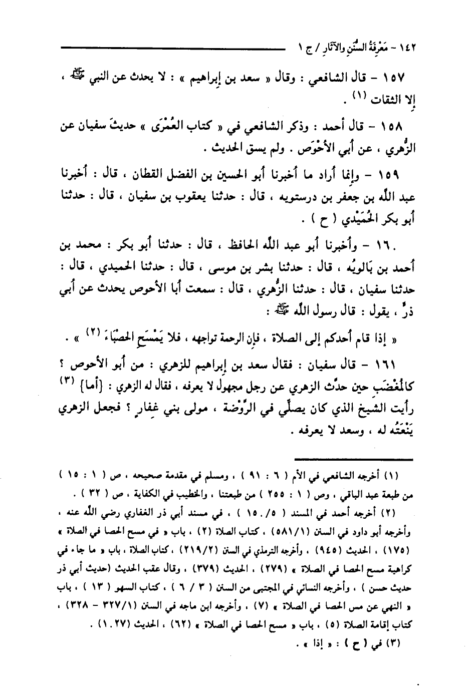 161 - قَالَ سُفْيَانُ: فَقَالَ سَعْدُ بْنُ إِبْرَاهِيمَ لِلزُّهْرِيِّ: مَنْ أَبُو الْأَحْوَصِ؟ كَالْمُغْضَبِ حِينَ حَدَّثَ الزُّهْرِيُّ عَنْ رَجُلٍ مَجْهُولٍ لَا يَعْرِفُهُ، فَقَالَ لَهُ الزُّهْرِيُّ: أَمَا رَأَيْتَ الشَّيْخَ الَّذِي كَانَ يُصَلِّي فِي الرَّوْضَةِ مَوْلَى بَنِي غِفَارٍ؟ فَجَعَلَ الزُّهْرِيُّ يَنْعَتُهُ لَهُ وَسَعْدٌ لَا يَعْرِفُهُ -[143]-.