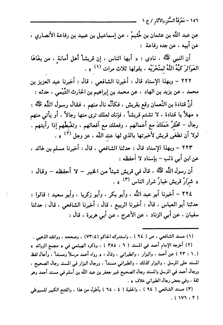 222 - وَبِهَذَا الْإِسْنَادِ قَالَ: أَخْبَرَنَا الشَّافِعِيُّ قَالَ: أَخْبَرَنَا عَبْدُ الْعَزِيزِ بْنُ مُحَمَّدٍ، عَنْ يَزِيدَ بْنِ الْهَادِ، عَنْ مُحَمَّدِ بْنِ إِبْرَاهِيمَ بْنِ الْحَارِثِ التَّيْمِيِّ حَدَّثَهُ أَنَّ قَتَادَةَ بْنَ النُّعْمَانِ وَقَعَ بِقُرَيْشٍ، فَكَأَنَّهُ نَالَ مِنْهُمْ، فَقَالَ رَسُولُ اللَّهِ صَلَّى اللهُ عَلَيْهِ وَسَلَّمَ: «§مَهْلًا يَا قَتَادَةُ، لَا تَشْتُمْ قُرَيْشًا؛ فَإِنَّكَ لَعَلَّكَ تَرَى مِنْهَا رِجَالًا، أَوْ يَأْتِيَ مِنْهُمْ رِجَالٌ، تَحْقِرُ عَمَلَكَ مَعَ أَعْمَالِهِمْ، وَفِعْلَكَ مَعَ أَفْعَالِهِمْ، وَتَغْبِطُهُمْ إِذَا رَأَيْتَهُمْ، لَوْلَا أَنْ تَطْغَى قُرَيْشٌ لَأَخْبَرْتُهَا بِالَّذِي لَهَا عِنْدَ اللَّهِ عَزَّ وَجَلَّ»