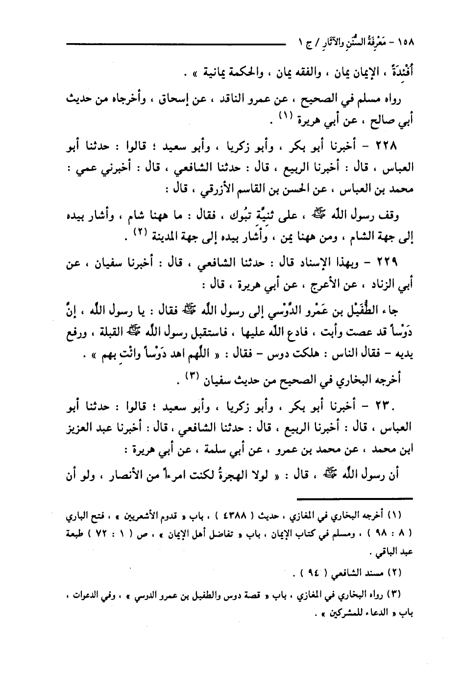 229 - وَبِهَذَا الْإِسْنَادِ قَالَ: حَدَّثَنَا الشَّافِعِيُّ قَالَ: أَخْبَرَنَا سُفْيَانُ، عَنْ أَبِي الزِّنَادِ، عَنِ الْأَعْرَجِ، عَنْ أَبِي هُرَيْرَةَ قَالَ: جَاءَ الطُّفَيْلُ بْنُ عَمْرٍو الدَّوْسِيُّ إِلَى رَسُولِ اللَّهِ صَلَّى اللهُ عَلَيْهِ وَسَلَّمَ فَقَالَ: يَا رَسُولَ اللَّهِ، إِنَّ دَوْسًا قَدْ عَصَتْ وَأَبَتْ، فَادْعُ اللَّهَ عَلَيْهَا، فَاسْتَقْبَلَ رَسُولُ اللَّهِ صَلَّى اللهُ عَلَيْهِ وَسَلَّمَ الْقِبْلَةَ وَرَفَعَ يَدَيْهِ، فَقَالَ النَّاسُ هَلَكَتْ دَوْسٌ، فَقَالَ: § «اللَّهُمَّ اهْدِ دَوْسًا وَائْتِ بِهِمْ» أَخْرَجَهُ الْبُخَارِيُّ فِي الصَّحِيحِ مِنْ حَدِيثِ سُفْيَانَ