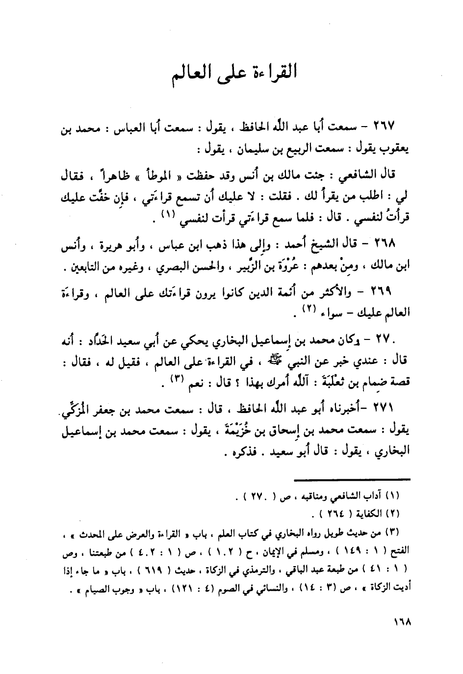 269 - وَالْأَكْثَرُ مِنَ أَئِمَّةِ الدِّينِ كَانُوا يَرَوْنَ قِرَاءَتَكَ عَلَى الْعَالِمِ وَقِرَاءَةَ الْعَالِمِ عَلَيْكَ سَوَاءٌ.