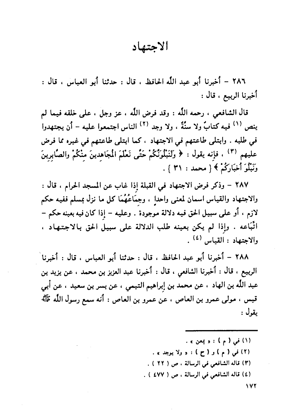 286 - أَخْبَرَنَا أَبُو عَبْدِ اللَّهِ الْحَافِظُ قَالَ: حَدَّثَنَا أَبُو الْعَبَّاسِ قَالَ أَخْبَرَنَا الرَّبِيعُ قَالَ: قَالَ: الشَّافِعِيُّ رَحِمَهُ اللَّهُ: وَقَدْ فَرَضَ اللَّهُ عَزَّ وَجَلَّ عَلَى خَلْقِهِ فِيمَا لَمْ يَنُصَّ فِيهِ كِتَابٌ وَلَا سُنَّةٌ، وَلَا وُجِدَ النَّاسُ اجْتَمَعُوا عَلَيْهِ أَنْ يَجْتَهِدُوا فِي طَلَبِهِ، وَابْتَلَى طَاعَتَهُمْ فِي الِاجْتِهَادِ كَمَا ابْتَلَى طَاعَتَهُمْ فِي غَيْرِهِ مِمَّا فَرَضَ عَلَيْهِمْ، فَإِنَّهُ يَقُولُ: {وَلَنَبْلُوَنَّكُمْ حَتَّى نَعْلَمَ الْمُجَاهِدِينَ مِنْكُمْ وَالصَّابِرِينَ وَنَبْلُوَ أَخْبَارَكُمْ} [محمد: 31]