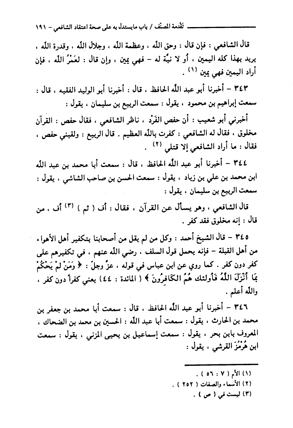 344 - أَخْبَرَنَا أَبُو عَبْدِ اللَّهِ الْحَافِظُ قَالَ: سَمِعْتُ أَبَا مُحَمَّدِ بْنَ عَبْدِ اللَّهِ بْنِ مُحَمَّدِ بْنِ عَلِيِّ بْنِ زِيَادٍ يَقُولُ: سَمِعْتُ الْحَسَنَ بْنَ صَاحِبٍ الشَّاشِيَّ يَقُولُ: سَمِعْتُ الرَّبِيعَ بْنَ سُلَيْمَانَ يَقُولُ: قَالَ الشَّافِعِيُّ - وَهُوَ يُسْأَلُ عَنِ الْقُرْآنِ - فَقَالَ: أُفٍّ ثُمَّ أُفٍّ §مَنْ قَالَ إِنَّهُ مَخْلُوقٌ فَقَدْ كَفَرَ.