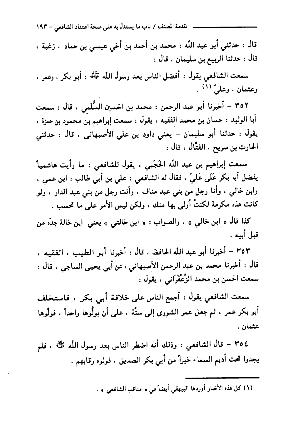 353 - أَخْبَرَنَا أَبُو عَبْدِ اللَّهِ الْحَافِظُ قَالَ أَخْبَرَنَا أَبُو الطَّيِّبٍ الْفَقِيهُ قَالَ: أَخْبَرَنَا مُحَمَّدُ بْنُ عَبْدِ الرَّحْمَنِ الْأَصْبَهَانِيُّ , عَنْ أَبِي يَحْيَى السَّاجِيِّ قَالَ: سَمِعْتُ الْحَسَنَ بْنَ مُحَمَّدٍ الزَّعْفَرَانِيَّ يَقُولُ: سَمِعْتُ الشَّافِعِيَّ يَقُولُ: §أَجْمَعَ النَّاسُ عَلَى خِلَافَةِ أَبِي بَكْرٍ فَاسْتَخْلَفَ أَبُو بَكْرٍ عُمَرَ ثُمَّ جَعَلَ عُمَرُ الشُّورَى إِلَى سِتَّةٍ عَلَى أَنْ يُوَلُّوهَا وَاحِدًا، فَوَلَّوْهَا عُثْمَانَ