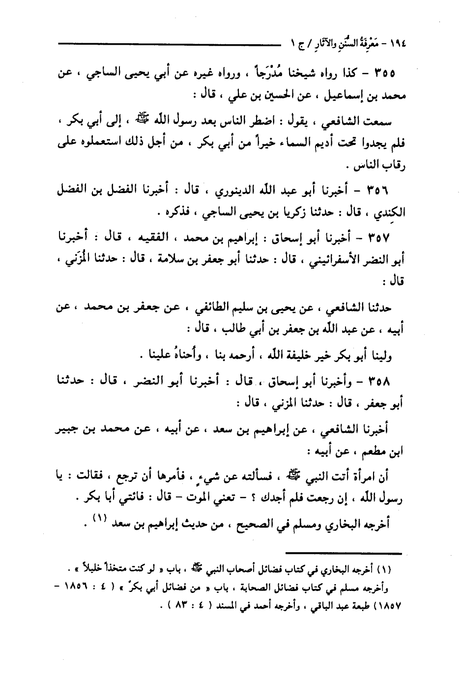 358 - وَأَخْبَرَنَا أَبُو إِسْحَاقَ قَالَ: أَخْبَرَنَا أَبُو النَّضْرِ قَالَ حَدَّثَنَا أَبُو جَعْفَرٍ قَالَ: حَدَّثَنَا الْمُزَنِيُّ قَالَ: أَخْبَرَنَا الشَّافِعِيُّ , عَنْ إِبْرَاهِيمَ بْنِ سَعْدٍ، عَنْ أَبِيهِ عَنْ مُحَمَّدِ بْنِ جُبَيْرِ بْنِ مُطْعَمٍ عَنْ أَبِيهِ: أَنَّ امْرَأَةً أَتَتِ النَّبِيَّ صَلَّى اللهُ عَلَيْهِ وَسَلَّمَ فَسَأَلَتْهُ عَنْ شَيْءٍ فَأَمَرَهَا أَنْ تَرْجِعَ، فَقَالَتْ: يَا رَسُولَ اللَّهِ، إِنْ رَجَعْتُ فَلَمْ أَجِدْكَ - تَعْنِي الْمَوْتَ - قَالَ: § «فَأْتِي أَبَا بَكْرٍ». أَخْرَجَهُ الْبُخَارِيُّ وَمُسْلِمٌ فِي الصَّحِيحِ مِنْ حَدِيثِ إِبْرَاهِيمَ بْنِ سَعْدٍ.