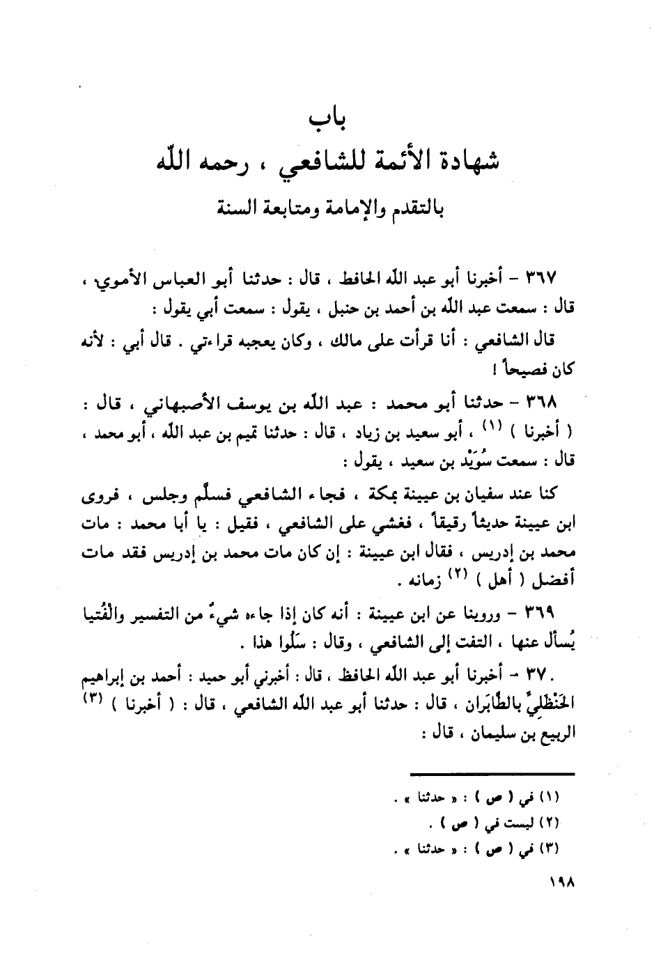 §بَابُ شَهَادَةِ الْأَئِمَّةِ لِلشَّافِعِيِّ رَحِمَهُ اللَّهُ بِالتَّقَدُّمِ وَالْإِمَامَةِ وَمُتَابَعَةِ السُّنَّةِ