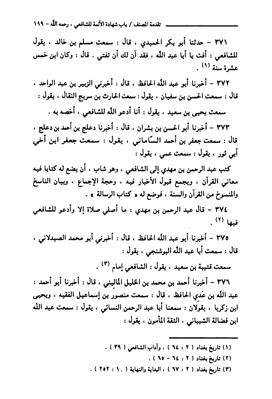 375 - أَخْبَرَنَا أَبُو عَبْدِ اللَّهِ الْحَافِظُ قَالَ: أَخْبَرَنِي أَبُو مُحَمَّدٍ الصَّيْدَلَانِيُّ قَالَ: سَمِعْتُ أَبَا عَبْدِ اللَّهِ الْبُوشَنْجِيَّ يَقُولُ: سَمِعْتُ قُتَيْبَةَ بْنَ سَعِيدٍ يَقُولُ: §الشَّافِعِيُّ إِمَامٌ