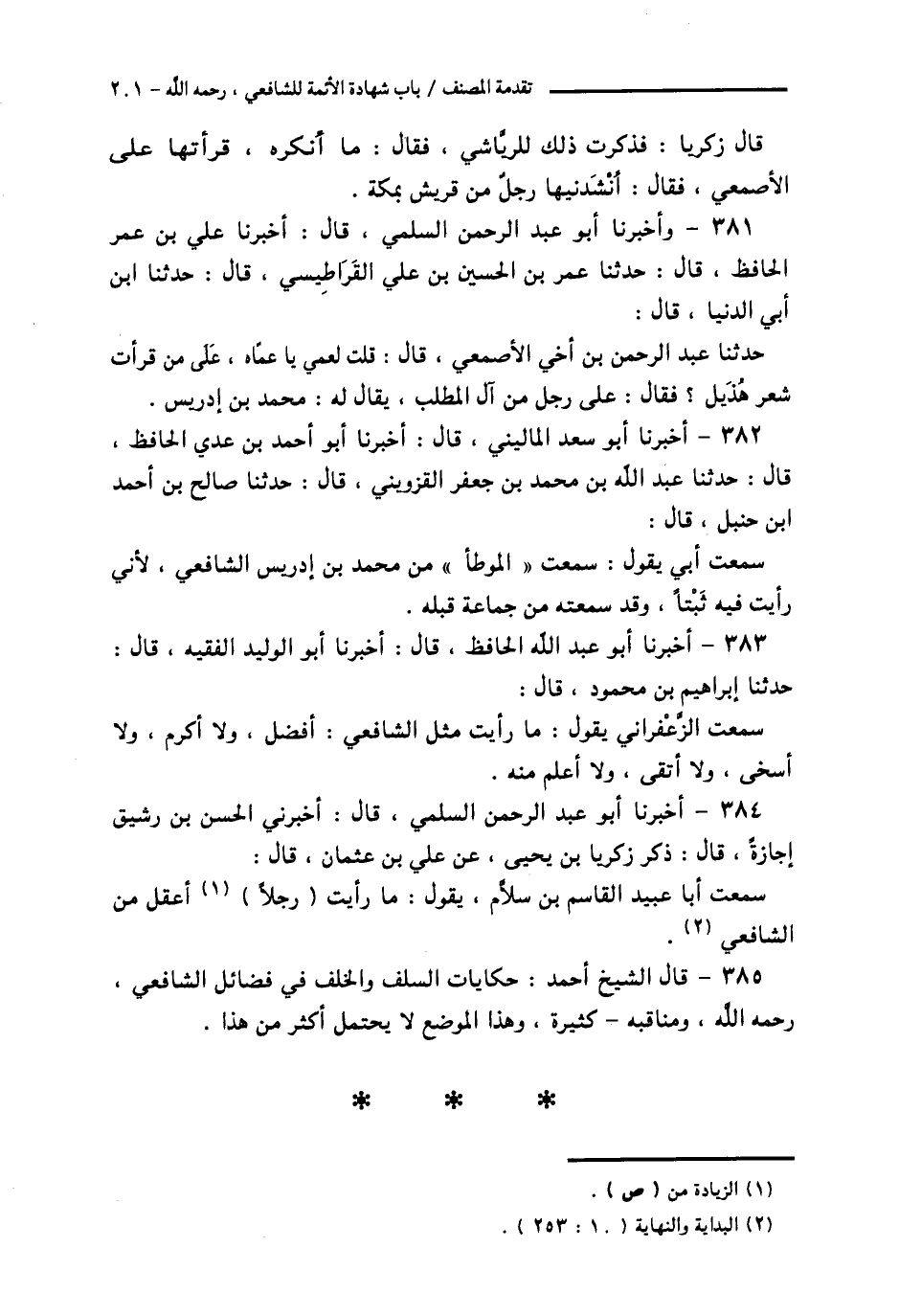385 - قَالَ الشَّيْخُ أَحْمَدُ: حِكَايَاتُ السَّلَفِ وَالْخَلَفِ فِي فَضَائِلِ الشَّافِعِيِّ رَحِمَهُ اللَّهُ وَمَنَاقِبِهِ كَثِيرَةٌ , وَهَذَا الْمَوْضِعُ لَا يَحْتَمِلُ أَكْثَرَ مِنْ هَذَا
