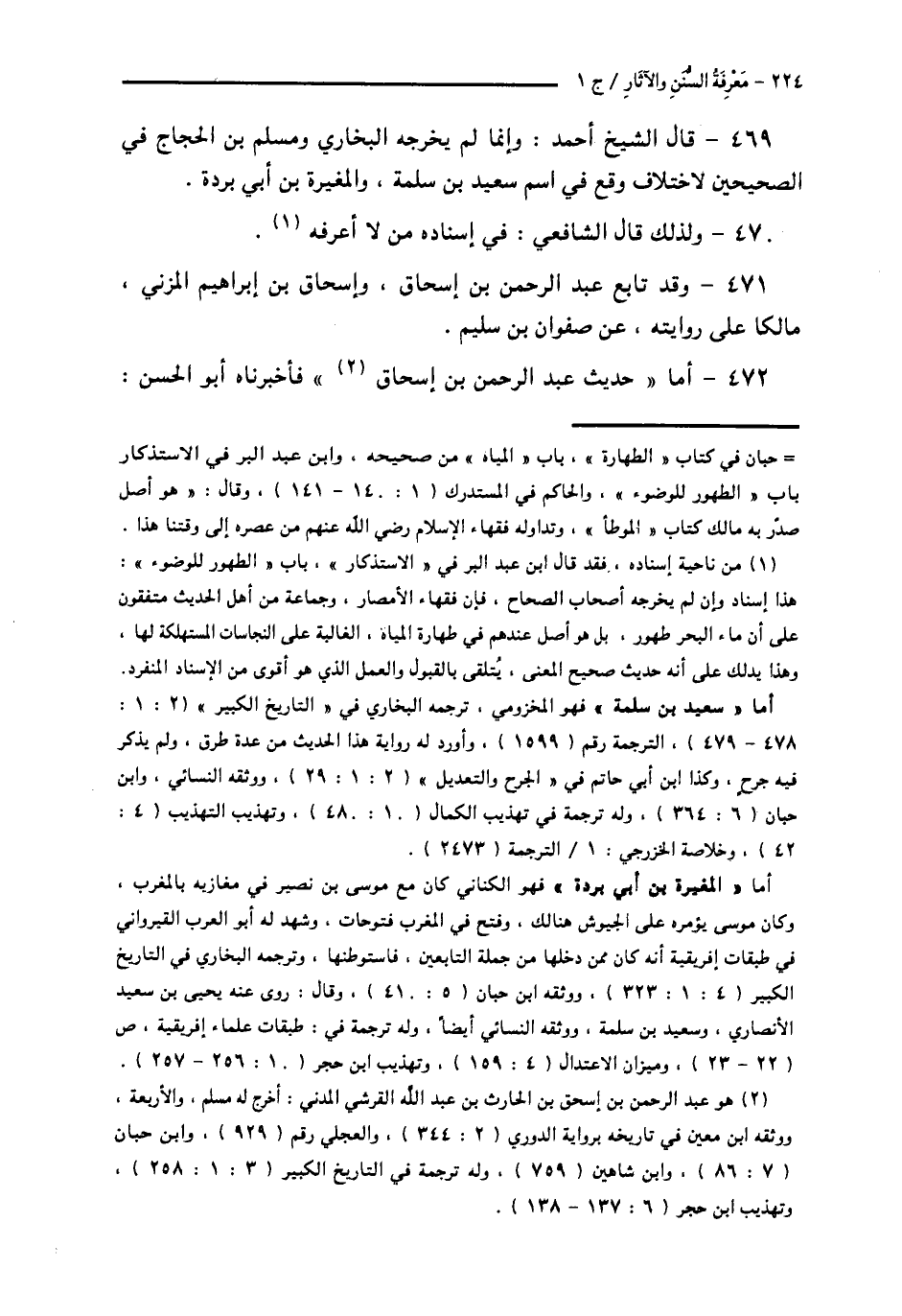 472 - أَمَّا حَدِيثُ عَبْدِ الرَّحْمَنِ بْنِ إِسْحَاقَ، فَأَخْبَرَنَاهُ أَبُو الْحَسَنِ -[225]- عَلِيُّ بْنُ مُحَمَّدِ بْنِ عَلِيٍّ بْنِ الْحُسَيْنُ الْمُقْرِئُ الْإِسْفِرَايِينِيُّ بِهَا قَالَ: أَخْبَرَنَا الْحَسَنُ بْنُ مُحَمَّدِ بْنِ إِسْحَاقَ الْإِسْفَرَايِينِيُّ قَالَ: حَدَّثَنَا يُوسُفُ بْنُ يَعْقُوبَ الْقَاضِي قَالَ: حَدَّثَنَا مُحَمَّدُ بْنُ أَبِي بَكْرٍ قَالَ: حَدَّثَنَا يَزِيدُ بْنُ زُرَيْعٍ قَالَ: حَدَّثَنَا عَبْدُ الرَّحْمَنِ بْنُ إِسْحَاقَ قَالَ: حَدَّثَنَا صَفْوَانُ بْنُ سُلَيْمٍ، عَنْ سَلَمَةَ بْنِ سَعِيدٍ، أَوْ سَعِيدِ بْنِ سَلَمَةَ، عَنِ الْمُغِيرَةِ بْنِ أَبِي بُرْدَةَ، عَنْ أَبِي هُرَيْرَةَ قَالَ: أَتَى نَاسٌ إِلَى رَسُولِ اللَّهِ صَلَّى اللهُ عَلَيْهِ وَسَلَّمَ فَقَالُوا: يَا رَسُولَ اللَّهِ إِنَّا نَرْكَبُ الْبَحْرَ، فَيَفْنَى الْمَاءُ، §فَنَتَوَضَّأُ بِمَاءِ الْبَحْرِ؟ فَقَالَ: «هُوَ الطَّهُورُ مَاؤُهُ، الْحَلَالُ مَيْتُهُ»