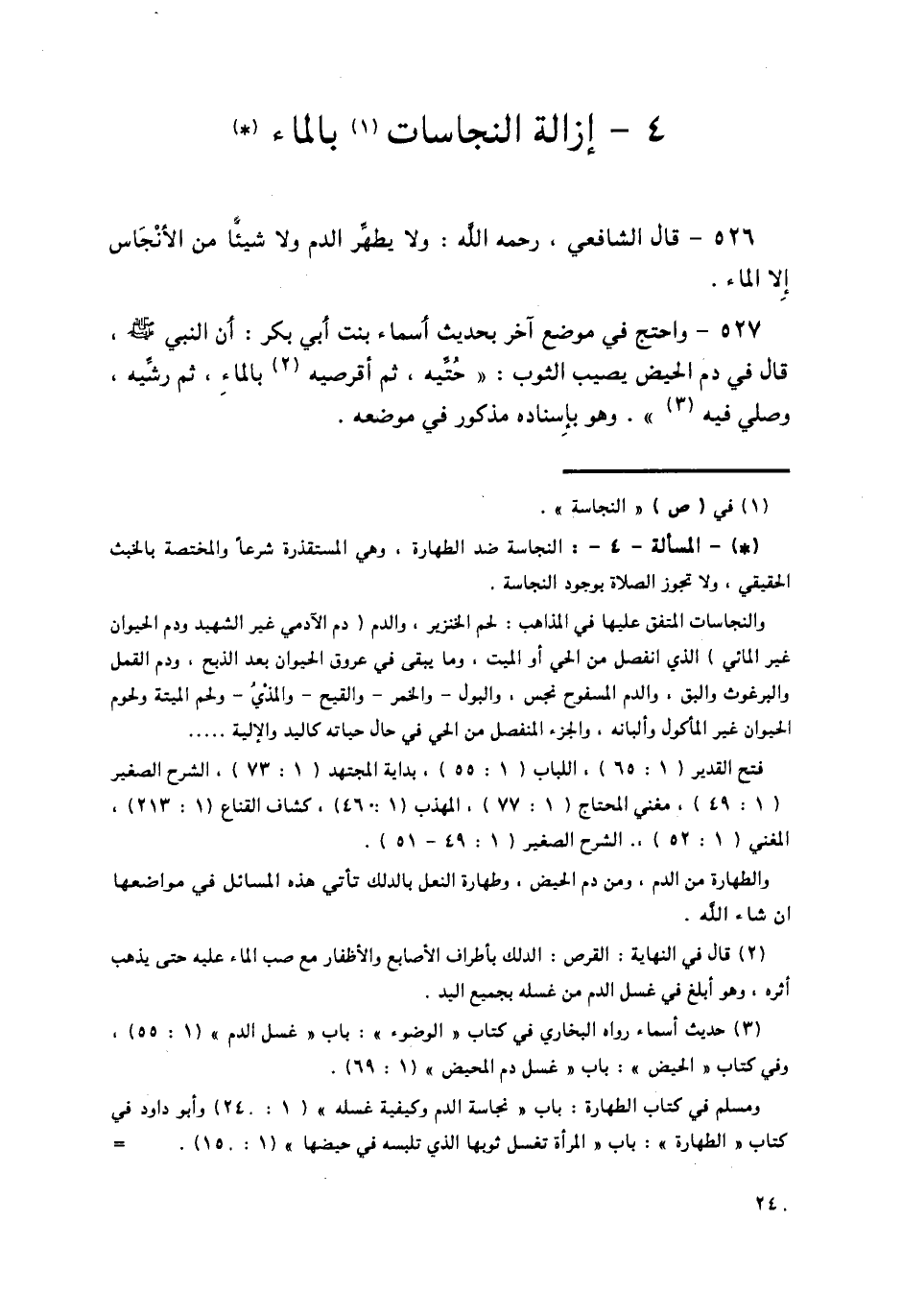 526 - قَالَ الشَّافِعِيُّ، رَحِمَهُ اللَّهُ: «وَلَا يُطَهِّرُ الدَّمَ وَلَا شَيْئًا مِنَ الْأَنْجَاسِ إِلَّا الْمَاءُ»
