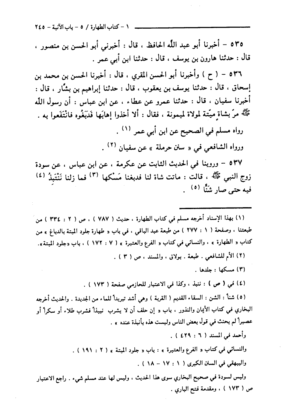 537 - وَرُوِّينَا فِي الْحَدِيثِ الثَّابِتِ، عَنْ عِكْرِمَةَ، عَنِ ابْنِ عَبَّاسٍ، عَنْ سَوْدَةَ، زَوْجِ النَّبِيِّ صَلَّى اللهُ عَلَيْهِ وَسَلَّمَ قَالَتْ: § «مَاتَتْ شَاةٌ لَنَا فَدَبَغْنَا مَسْكَهَا فَمَا زِلْنَا نَنْتَبِذُ فِيهِ حَتَّى صَارَ شَنًّا»