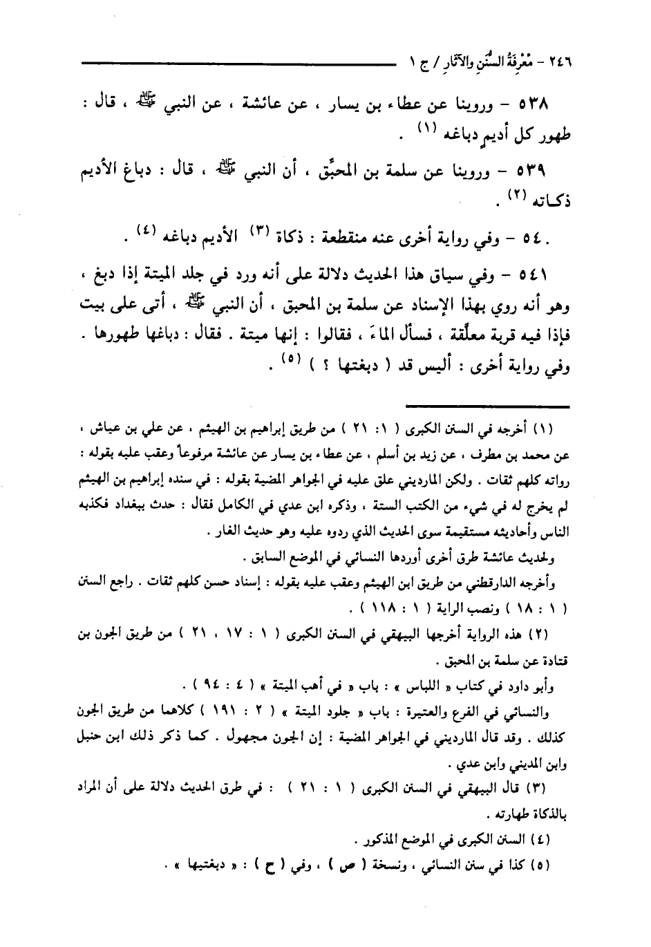 538 - وَرُوِّينَا عَنْ عَطَاءِ بْنِ يَسَارٍ، عَنْ عَائِشَةَ، عَنِ النَّبِيِّ صَلَّى اللهُ عَلَيْهِ وَسَلَّمَ قَالَ: § «طَهُورُ كُلِّ أَدِيمٍ دِبَاغُهُ»
