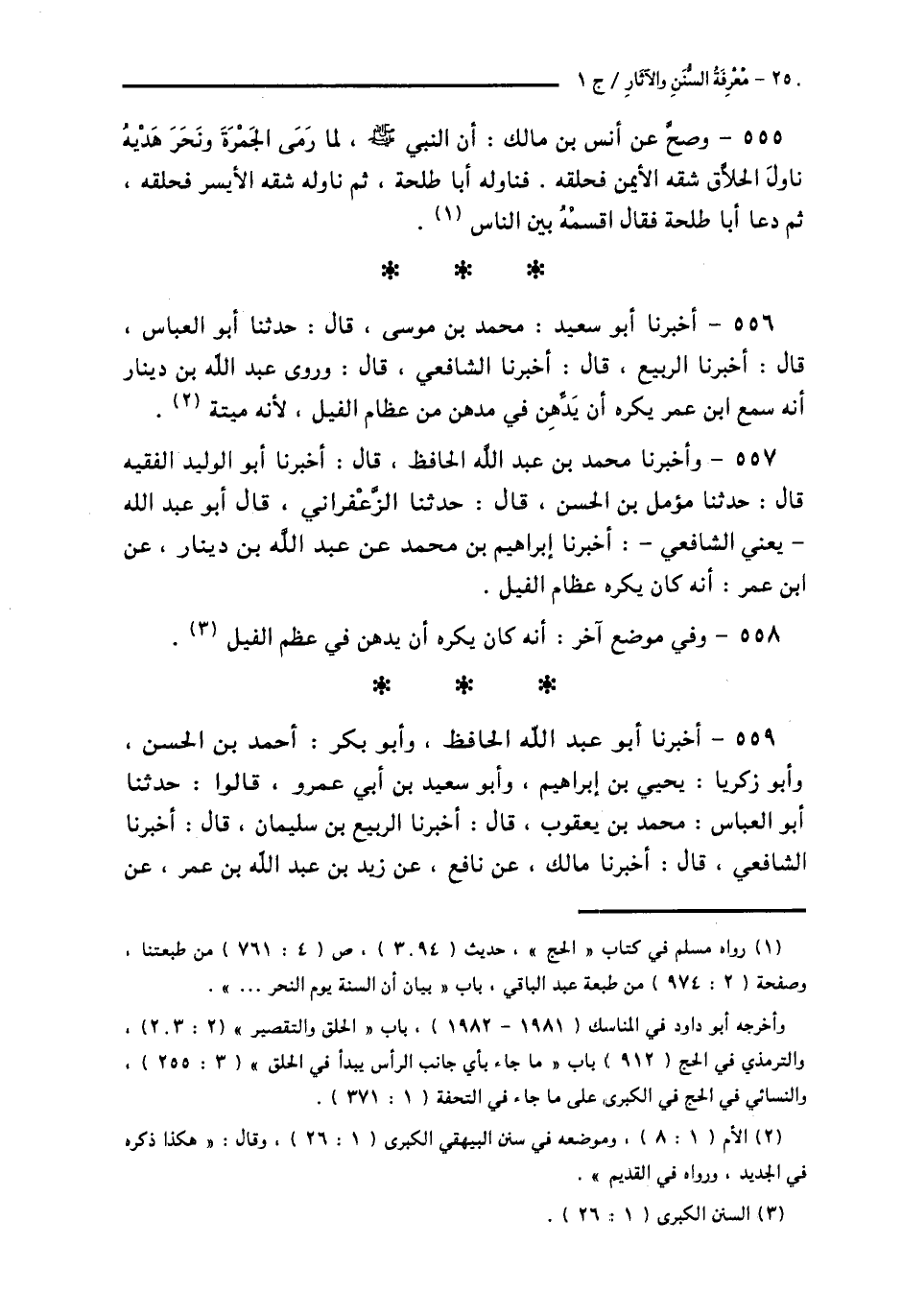 555 - وَصَحَّ عَنْ أَنَسِ بْنِ مَالِكٍ: أَنَّ النَّبِيَّ صَلَّى اللهُ عَلَيْهِ وَسَلَّمَ، §لَمَّا رَمَى الْجَمْرَةَ وَنَحَرَ هَدْيَهُ نَاوَلَ الْحَلَّاقَ شِقَّهُ الْأَيْمَنَ فَحَلَقَهُ. فَنَاوَلَهُ أَبَا طَلْحَةَ، ثُمَّ نَاوَلَهُ شِقَّهُ الْأَيْسَرَ فَحَلَقَهُ، ثُمَّ دَعَا أَبَا طَلْحَةَ، فَقَالَ: «اقْسِمْهُ بَيْنَ النَّاسِ»