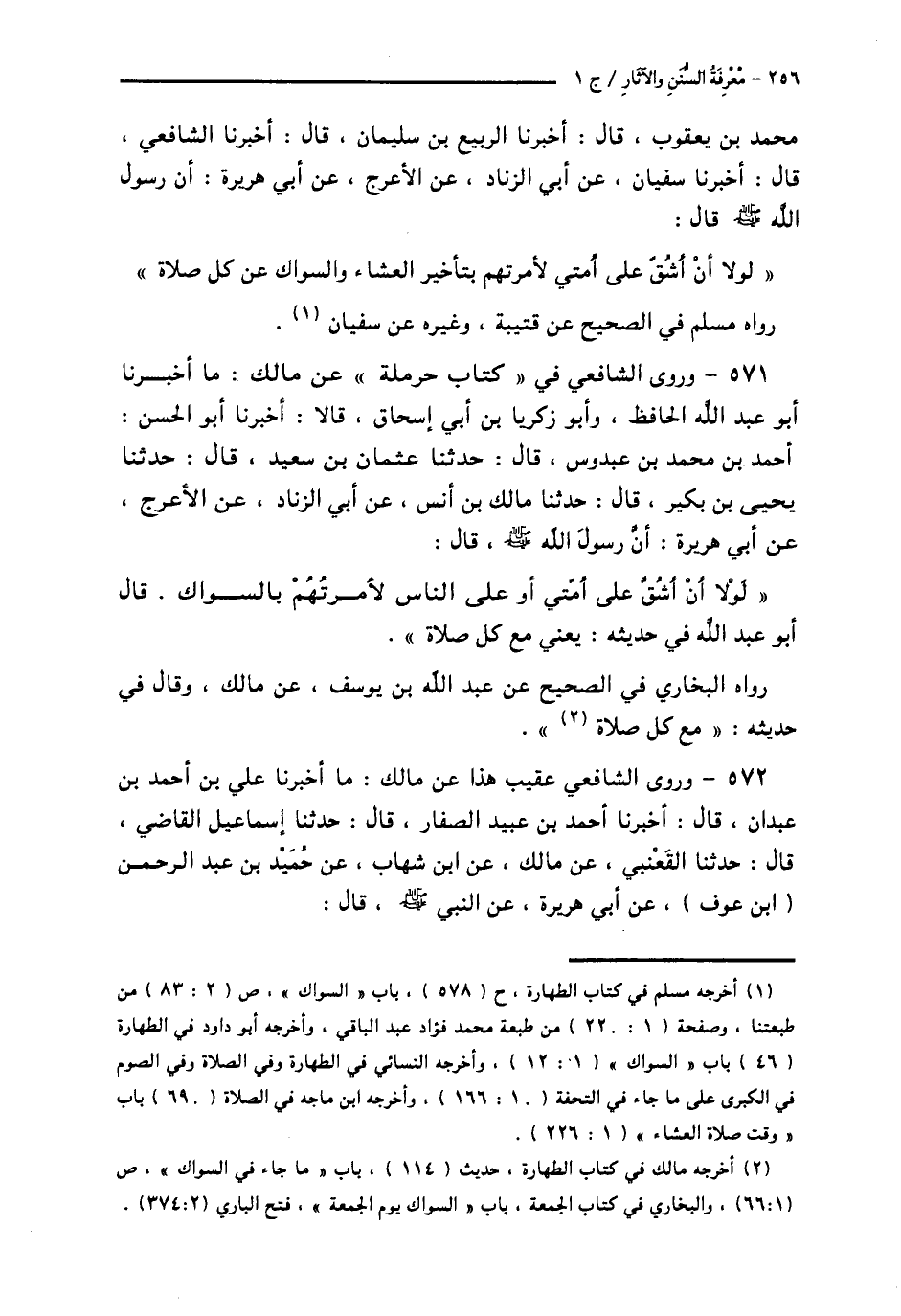 571 - وَرَوَى الشَّافِعِيُّ فِي كِتَابِ حَرْمَلَةَ، عَنْ مَالِكٍ: مَا أَخْبَرَنَا أَبُو عَبْدِ اللَّهِ الْحَافِظُ، وَأَبُو زَكَرِيَّا بْنُ أَبِي إِسْحَاقَ قَالَا: أَخْبَرَنَا أَبُو الْحَسَنِ أَحْمَدُ بْنُ مُحَمَّدِ بْنِ عَبْدُوسٍ قَالَ: حَدَّثَنَا عُثْمَانُ بْنُ سَعِيدٍ قَالَ: حَدَّثَنَا يَحْيَى بْنُ بُكَيْرٍ قَالَ: حَدَّثَنَا مَالِكُ بْنُ أَنَسٍ، عَنْ أَبِي الزِّنَادٍ، عَنِ الْأَعْرَجِ، عَنْ أَبِي هُرَيْرَةَ: أَنَّ رَسُولَ اللَّهِ صَلَّى اللهُ عَلَيْهِ وَسَلَّمَ قَالَ: § «لَوْلَا أَنْ أَشُقَّ عَلَى أُمَّتِي أَوْ عَلَى النَّاسِ لَأَمَرْتُهُمْ بِالسِّوَاكِ». قَالَ أَبُو عَبْدِ اللَّهِ فِي حَدِيثِهِ: يَعْنِي مَعَ كُلِّ صَلَاةٍ رَوَاهُ الْبُخَارِيُّ فِي الصَّحِيحِ عَنْ عَبْدِ اللَّهِ بْنِ يُوسُفَ، عَنْ مَالِكٍ، وَقَالُ فِي حَدِيثِهِ: «مَعَ كُلِّ صَلَاةٍ»