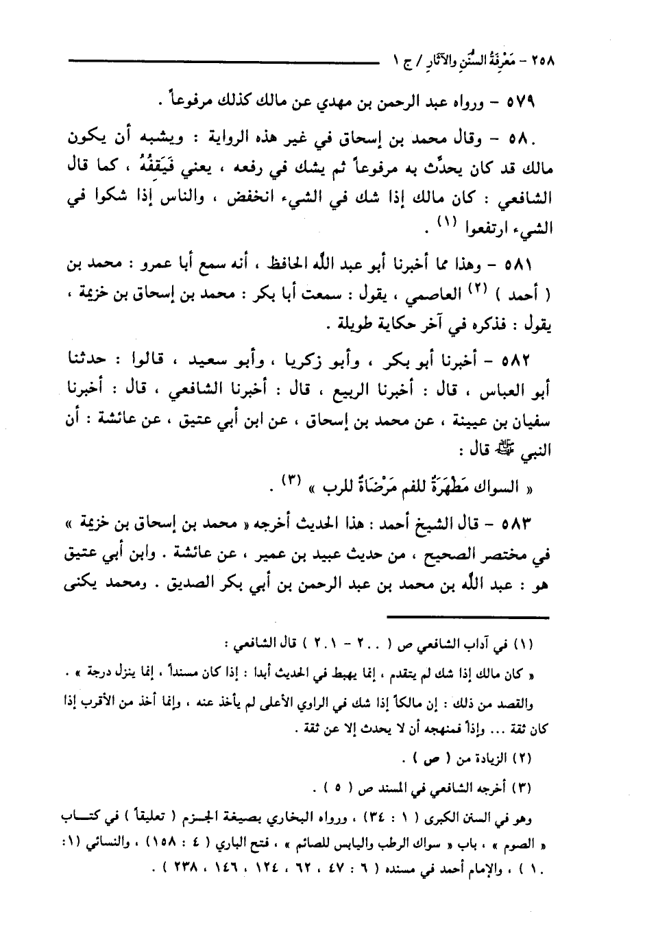 582 - أَخْبَرَنَا أَبُو بَكْرٍ، وَأَبُو زَكَرِيَّا، وَأَبُو سَعِيدٍ، قَالُوا: حَدَّثَنَا أَبُو الْعَبَّاسِ قَالَ: أَخْبَرَنَا الرَّبِيعُ قَالَ: أَخْبَرَنَا الشَّافِعِيُّ قَالَ: أَخْبَرَنَا سُفْيَانُ بْنُ عُيَيْنَةَ، عَنْ مُحَمَّدِ بْنِ إِسْحَاقَ، عَنِ ابْنِ أَبِي عَتِيقٍ، عَنْ عَائِشَةَ، أَنَّ النَّبِيَّ صَلَّى اللهُ عَلَيْهِ وَسَلَّمَ قَالَ: «§السِّوَاكُ مَطْهَرَةٌ لِلْفَمِ مَرْضَاةٌ لِلرَّبِّ»