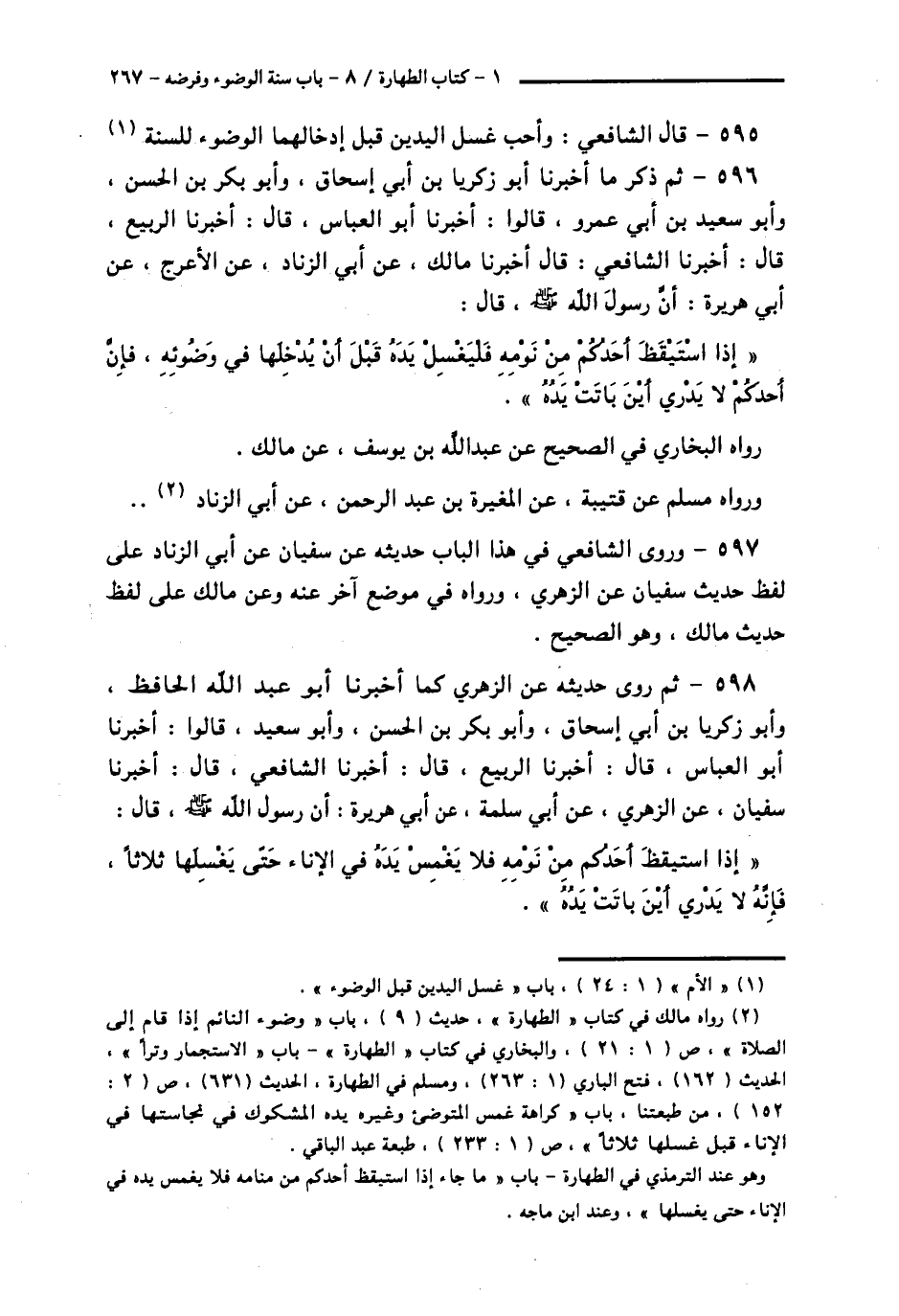 598 - ثُمَّ رَوَى حَدِيثَهُ، عَنِ الزُّهْرِيِّ، كَمَا أَخْبَرَنَا أَبُو عَبْدِ اللَّهِ الْحَافِظُ، وَأَبُو زَكَرِيَّا بْنُ أَبِي إِسْحَاقَ، وَأَبُو بَكْرِ بْنُ الْحَسَنِ، وَأَبُو سَعِيدٍ، قَالُوا: أَخْبَرَنَا أَبُو الْعَبَّاسِ قَالَ: أَخْبَرَنَا الرَّبِيعُ قَالَ: أَخْبَرَنَا الشَّافِعِيُّ قَالَ: أَخْبَرَنَا سُفْيَانُ، عَنِ الزُّهْرِيِّ، عَنْ أَبِي سَلَمَةَ، عَنْ أَبِي هُرَيْرَةَ: أَنَّ رَسُولَ اللَّهِ صَلَّى اللهُ عَلَيْهِ وَسَلَّمَ قَالَ: § «إِذَا اسْتَيْقَظَ أَحَدُكُمْ مِنْ نَوْمِهِ فَلَا يَغْمِسْ يَدَهُ فِي الْإِنَاءِ حَتَّى يَغْسِلَهَا ثَلَاثًا، فَإِنَّهُ لَا يَدْرِي أَيْنَ بَاتَتْ يَدُهُ» -[268]-. رَوَاهُ مُسْلِمٌ فِي الصَّحِيحِ، عَنْ عَمْرٍو النَّاقِدِ وَغَيْرِهِ، عَنْ سُفْيَانَ،