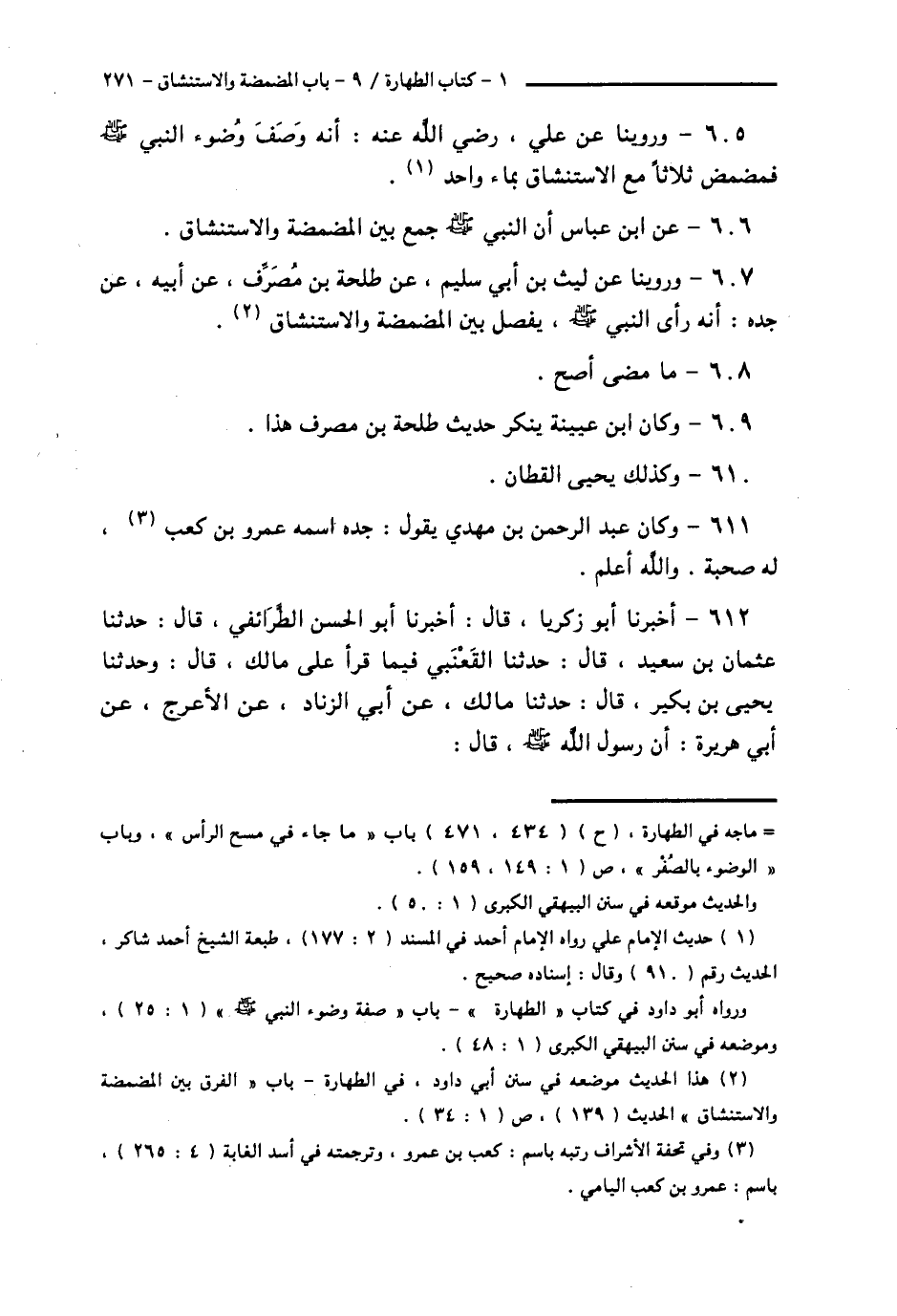 607 - وَرُوِّينَا عَنْ لَيْثِ بْنِ أَبِي سُلَيْمٍ، عَنْ طَلْحَةَ بْنِ مُصَرِّفٍ، عَنْ أَبِيهِ، عَنْ جَدِّهِ، «أَنَّهُ رَأَى النَّبِيَّ صَلَّى اللهُ عَلَيْهِ وَسَلَّمَ، §يَفْصِلُ بَيْنَ الْمَضْمَضَةِ وَالِاسْتِنْشَاقِ»،