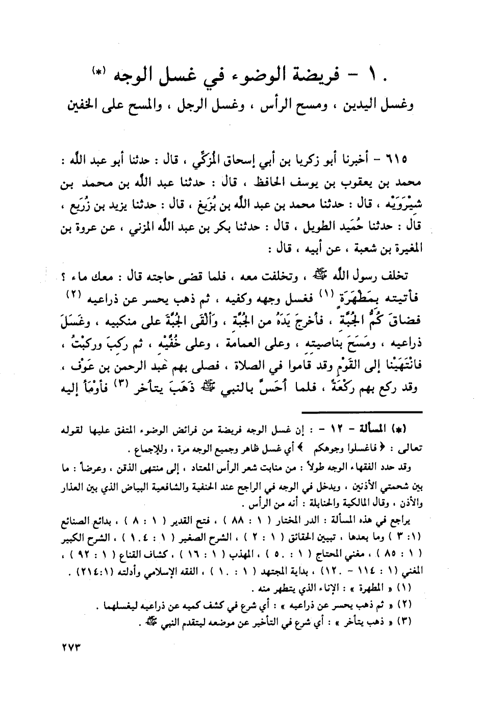 615 - أَخْبَرَنَا أَبُو زَكَرِيَّا بْنُ أَبِي إِسْحَاقَ الْمُزَكِّي قَالَ: حَدَّثَنَا أَبُو عَبْدِ اللَّهِ مُحَمَّدُ بْنُ يَعْقُوبَ بْنِ يُوسُفَ الْحَافِظُ قَالَ: حَدَّثَنَا عَبْدُ اللَّهِ بْنُ مُحَمَّدِ بْنِ شِيرَوَيْهِ قَالَ: حَدَّثَنَا مُحَمَّدُ بْنُ عَبْدِ اللَّهِ بْنِ بَزِيعٍ قَالَ: حَدَّثَنَا يَزِيدُ بْنُ زُرَيْعٍ قَالَ: حَدَّثَنَا حُمَيْدٌ الطَّوِيلُ قَالَ: حَدَّثَنَا بَكْرُ بْنُ عَبْدِ اللَّهِ الْمُزَنِيُّ، عَنْ عُرْوَةَ بْنِ الْمُغِيرَةِ بْنِ شُعْبَةَ، عَنْ أَبِيهِ قَالَ: تَخَلَّفَ رَسُولُ اللَّهِ صَلَّى اللهُ عَلَيْهِ وَسَلَّمَ وَتَخَلَّفْتُ مَعَهُ، فَلَمَّا قَضَى حَاجَتَهُ قَالَ: «مَعَكَ مَاءٌ؟»، §فَأَتَيْتُهُ بِمُطْهَرَةٍ فَغَسَلَ وَجْهَهُ وَكَفَّيْهِ، ثُمَّ ذَهَبَ يَحْسِرُ عَنْ ذِرَاعَيْهِ فَضَاقَ كُمُّ الْجُبَّةِ، فَأَخْرَجَ يَدَهُ مِنَ الْجُبَّةِ، وَأَلْقَى الْجُبَّةَ عَلَى مَنْكِبَيْهِ، وَغَسَلَ ذِرَاعَيْهِ، وَمَسَحَ بِنَاصِيَتِهِ، وَعَلَى الْعِمَامَةِ، وَعَلَى خُفَّيْهِ، ثُمَّ رَكِبَ وَرَكِبْتُ، فَانْتَهَيْنَا إِلَى الْقَوْمِ وَقَدْ قَامُوا فِي الصَّلَاةِ، فَصَلَّى بِهِمْ عَبْدُ الرَّحْمَنِ بْنُ عَوْفٍ، وَقَدْ رَكَعَ بِهِمْ رَكْعَةً، فَلَمَّا أَحَسَّ بِالنَّبِيِّ صَلَّى اللهُ عَلَيْهِ وَسَلَّمَ ذَهَبَ يَتَأَخَّرُ، فَأَوْمَأَ إِلَيْهِ -[274]- فَصَلَّى بِهِمْ، فَلَمَّا سَلَّمَ قَامَ النَّبِيُّ صَلَّى اللهُ عَلَيْهِ وَسَلَّمَ، وَقُمْتُ مَعَهُ، فَرَكَعْنَا الرَّكْعَةَ الَّتِي سَبَقَتْنَا