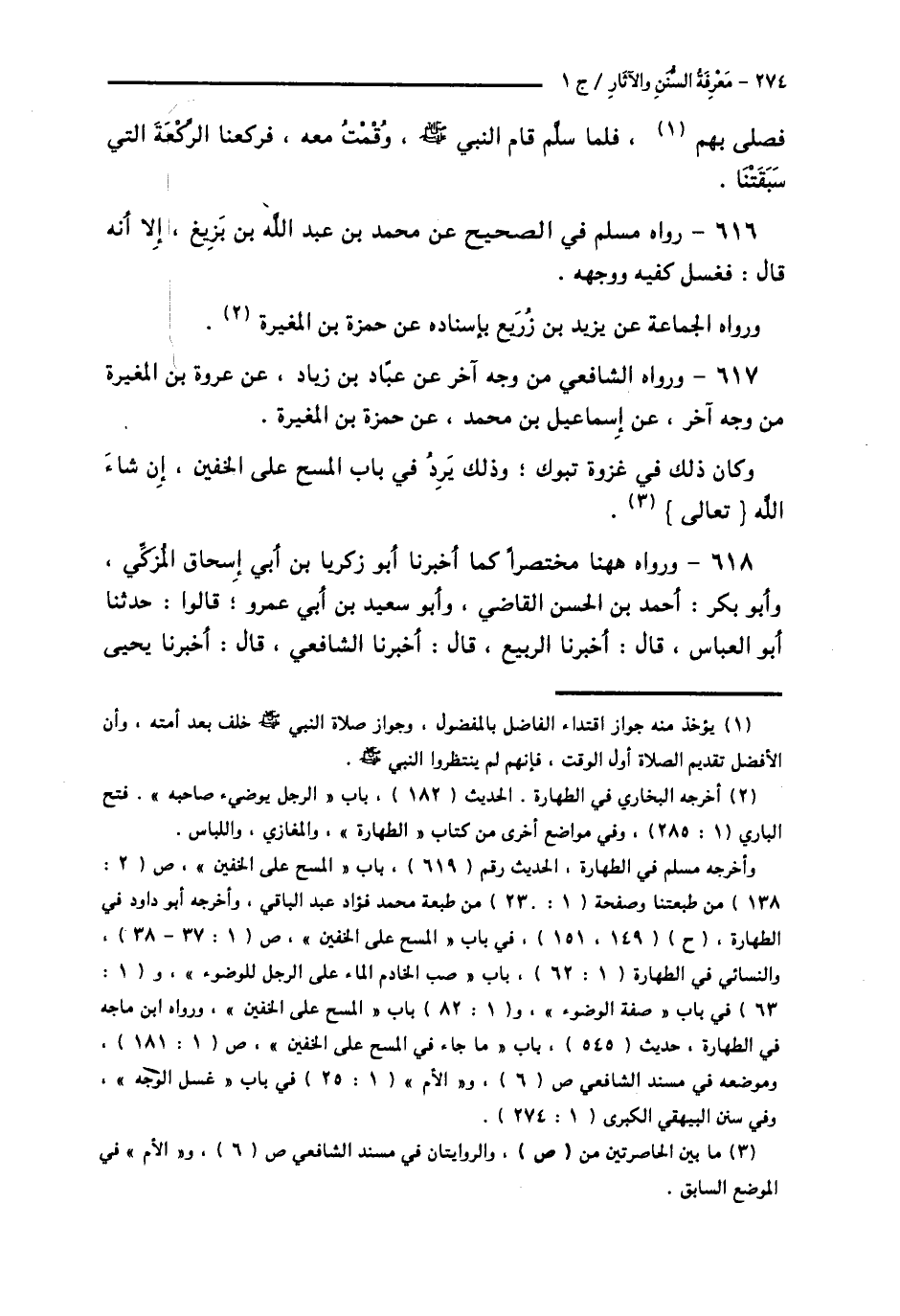 618 - وَرَوَاهُ هَهُنَا مُخْتَصَرًا كَمَا أَخْبَرَنَا أَبُو زَكَرِيَّا بْنُ أَبِي إِسْحَاقَ الْمُزَكِّي، وَأَبُو بَكْرٍ أَحْمَدُ بْنُ الْحَسَنِ الْقَاضِي، وَأَبُو سَعِيدِ بْنُ أَبِي عَمْرٍو، قَالُوا: حَدَّثَنَا أَبُو الْعَبَّاسِ قَالَ: أَخْبَرَنَا الرَّبِيعُ قَالَ: أَخْبَرَنَا الشَّافِعِيُّ قَالَ: أَخْبَرَنَا يَحْيَى -[275]- بْنُ حَسَّانَ، عَنْ حَمَّادِ بْنِ زَيْدٍ، وَابْنُ عُلَيَّةَ، عَنْ أَيُّوبَ، عَنْ مُحَمَّدِ بْنِ سِيرِينَ، عَنْ عَمْرِو بْنِ وَهْبٍ الثَّقَفِيِّ، عَنِ الْمُغِيرَةِ بْنِ شُعْبَةَ، «أَنَّ النَّبِيَّ صَلَّى اللهُ عَلَيْهِ وَسَلَّمَ §تَوَضَّأَ فَمَسَحَ بِنَاصِيَتِهِ وَعَلَى عِمَامَتِهِ وَخُفَّيْهِ»
