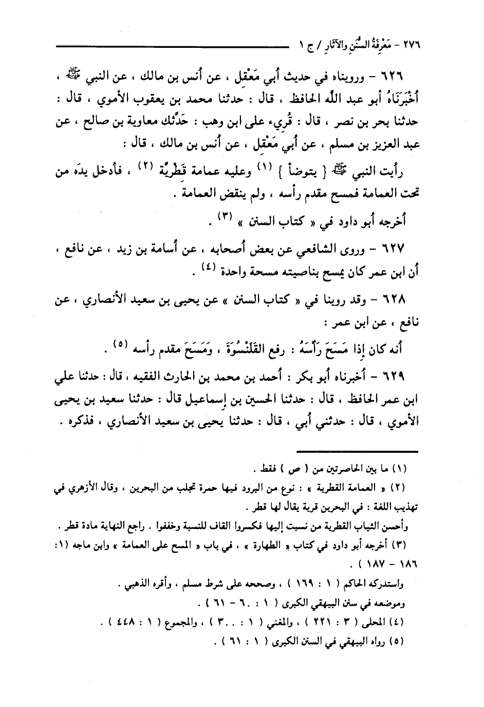 626 - وَرَوَيْنَاهُ فِي حَدِيثِ أَبِي مَعْقِلٍ، عَنْ أَنَسِ بْنِ مَالِكٍ، عَنِ النَّبِيِّ صَلَّى اللهُ عَلَيْهِ وَسَلَّمَ، أَخْبَرَنَاهُ أَبُو عَبْدِ اللَّهِ الْحَافِظُ قَالَ: حَدَّثَنَا مُحَمَّدُ بْنُ يَعْقُوبَ الْأُمَوِيُّ قَالَ: حَدَّثَنَا بَحْرُ بْنُ نَصْرٍ قَالَ: قُرِئَ عَلَى ابْنِ وَهْبٍ: حَدَّثَكَ مُعَاوِيَةُ بْنُ صَالِحٍ، عَنْ عَبْدِ الْعَزِيزِ بْنِ مُسْلِمٍ، عَنْ أَبِي مَعْقِلٍ، عَنْ أَنَسِ بْنِ مَالِكٍ قَالَ: «رَأَيْتُ النَّبِيَّ صَلَّى اللهُ عَلَيْهِ وَسَلَّمَ §يَتَوَضَّأُ وَعَلَيْهِ عِمَامَةٌ قِطْرِيَّةٌ فَأَدْخَلَ يَدَهُ مِنْ تَحْتِ الْعِمَامَةِ فَمَسَحَ مُقَدَّمَ رَأْسِهِ، وَلَمْ يَنْقُضِ الْعِمَامَةَ». أَخْرَجَهُ أَبُو دَاوُدَ فِي كِتَابِ السُّنَنِ
