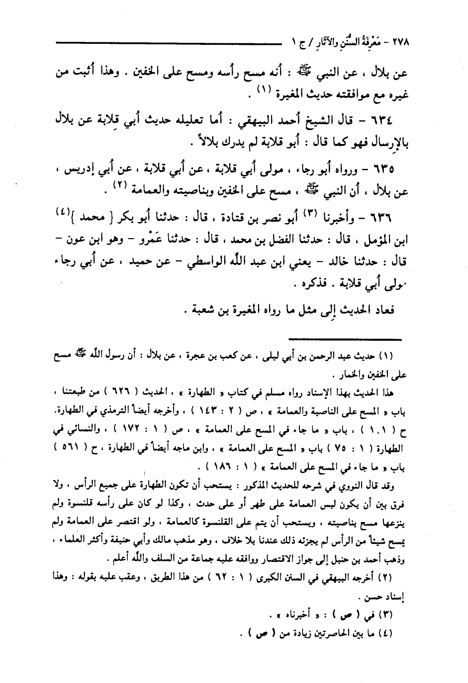635 - وَرَوَاهُ أَبُو رَجَاءٍ، مَوْلَى أَبِي قِلَابَةَ، عَنْ أَبِي قِلَابَةَ، عَنْ أَبِي إِدْرِيسَ، عَنْ بِلَالٍ: «أَنَّ النَّبِيَّ صَلَّى اللهُ عَلَيْهِ وَسَلَّمَ §مَسَحَ عَلَى الْخُفَّيْنِ، وَبِنَاصِيَتِهِ، وَالْعِمَامَةِ».