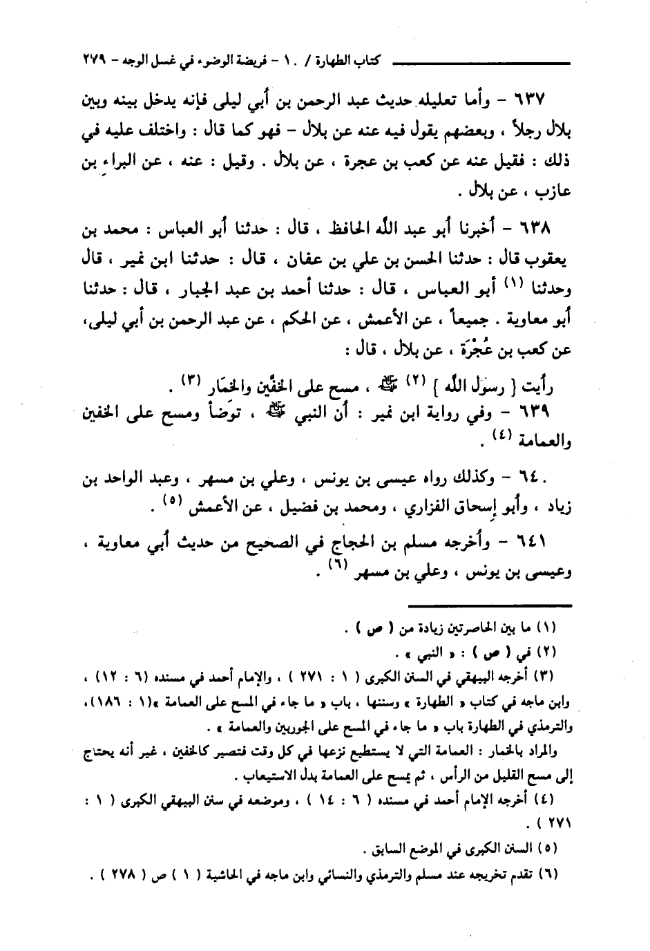 638 - أَخْبَرَنَا أَبُو عَبْدِ اللَّهِ الْحَافِظُ قَالَ: حَدَّثَنَا أَبُو الْعَبَّاسِ مُحَمَّدُ بْنُ يَعْقُوبَ قَالَ: حَدَّثَنَا الْحُسَيْنُ بْنُ عَلِيِّ بْنِ عَفَّانَ قَالَ: حَدَّثَنَا ابْنُ نُمَيْرٍ قَالَ: وَحَدَّثَنَا أَبُو الْعَبَّاسِ قَالَ: حَدَّثَنَا أَحْمَدُ بْنُ عَبْدِ الْجَبَّارِ قَالَ: حَدَّثَنَا أَبُو مُعَاوِيَةَ، جَمِيعًا، عَنِ الْأَعْمَشِ، عَنِ الْحَكَمِ، عَنْ عَبْدِ الرَّحْمَنِ بْنِ أَبِي لَيْلَى، عَنْ كَعْبِ بْنِ عُجْرَةَ، عَنْ بِلَالٍ قَالَ: «رَأَيْتُ رَسُولَ اللَّهِ صَلَّى اللهُ عَلَيْهِ وَسَلَّمَ §مَسَحَ عَلَى الْخُفَّيْنِ، وَالْخِمَارِ».