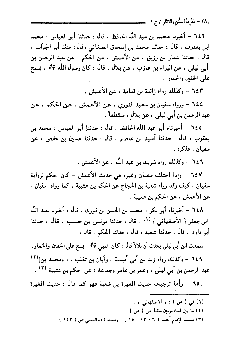 648 - أَخْبَرَنَاهُ أَبُو بَكْرٍ مُحَمَّدُ بْنُ الْحَسَنِ بْنِ فُورَكٍ قَالَ: أَخْبَرَنَا عَبْدُ اللَّهِ بْنُ جَعْفَرٍ الْأَصْبَهَانِيُّ قَالَ: حَدَّثَنَا يُونُسُ بْنُ حَبِيبٍ قَالَ: حَدَّثَنَا أَبُو دَاوُدَ قَالَ: حَدَّثَنَا شُعْبَةُ قَالَ: حَدَّثَنَا الْحَكَمُ قَالَ: سَمِعْتُ ابْنَ أَبِي لَيْلَى، يُحَدِّثُ أَنَّ بِلَالًا، قَالَ: «كَانَ النَّبِيُّ صَلَّى اللهُ عَلَيْهِ وَسَلَّمَ §يَمْسَحُ عَلَى الْخُفَّيْنِ وَالْخِمَارِ»،