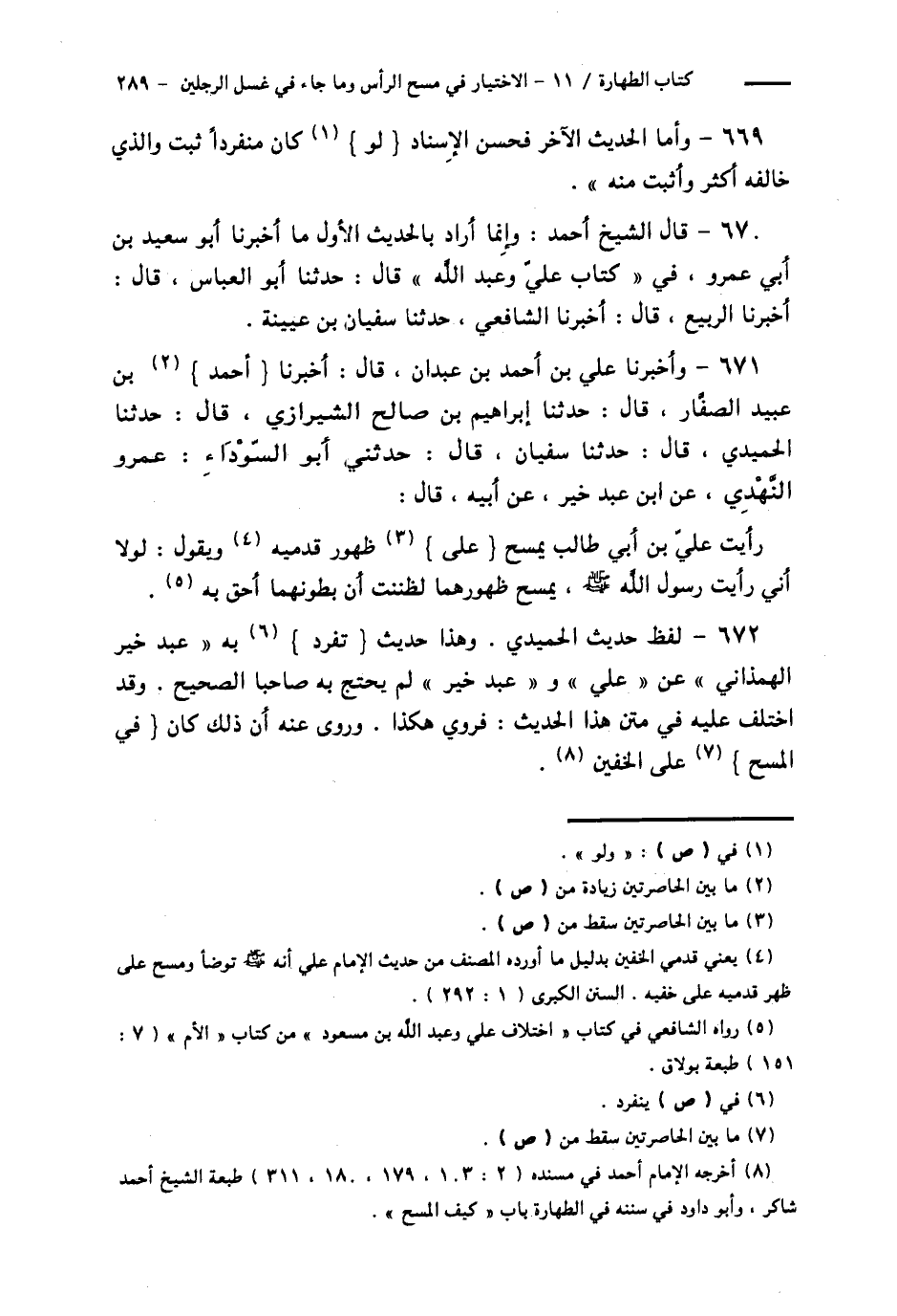 671 - وَأَخْبَرَنَا عَلِيُّ بْنُ أَحْمَدَ بْنِ عَبْدَانَ قَالَ: أَخْبَرَنَا أَحْمَدُ بْنُ عُبَيْدٍ الصَّفَّارُ قَالَ: حَدَّثَنَا إِبْرَاهِيمُ بْنُ صَالِحٍ الشِّيرَازِيُّ قَالَ: حَدَّثَنَا الْحُمَيْدِيُّ قَالَ: حَدَّثَنَا سُفْيَانُ قَالَ: حَدَّثَنِي أَبُو السَّوْدَاءِ عَمْرٌو النَّهْدِيُّ، عَنِ ابْنِ عَبْدِ خَيْرٍ، عَنْ أَبِيهِ قَالَ: رَأَيْتُ عَلِيَّ بْنَ أَبِي طَالِبٍ §يَمْسَحُ عَلَى ظُهُورِ قَدَمَيْهِ، وَيَقُولُ: «لَوْلَا أَنِّي رَأَيْتُ رَسُولَ اللَّهِ صَلَّى اللهُ عَلَيْهِ وَسَلَّمَ يَمْسَحُ ظُهُورَهُمَا لَظَنَنْتُ أَنَّ بُطُونَهُمَا أَحَقَّ بِهِ»