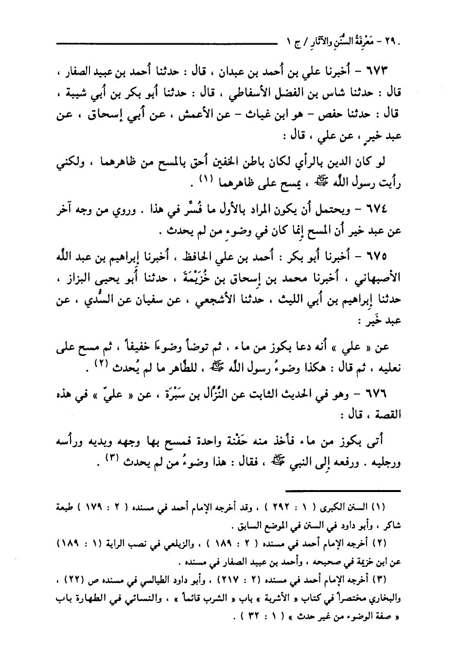 673 - أَخْبَرَنَا عَلِيُّ بْنُ أَحْمَدَ بْنِ عَبْدَانَ قَالَ: حَدَّثَنَا أَحْمَدُ بْنُ عُبَيْدٍ الصَّفَّارُ قَالَ: حَدَّثَنَا شاسُ بْنُ الْفَضْلِ الْأَسْفَاطِيُّ قَالَ: حَدَّثَنَا أَبُو بَكْرِ بْنُ أَبِي شَيْبَةَ قَالَ: حَدَّثَنَا حَفْصٌ هُوَ ابْنُ غِيَاثٍ، عَنِ الْأَعْمَشِ، عَنْ أَبِي إِسْحَاقَ، عَنْ عَبْدِ خَيْرٍ، عَنْ عَلِيٍّ قَالَ: «لَوْ كَانَ الدِّينُ بِالرَّأْيِ لَكَانَ بَاطِنُ الْخُفَّيْنِ أَحَقَّ بِالْمَسْحِ مِنْ ظَاهِرِهِمَا، وَلَكِنِّي رَأَيْتُ رَسُولَ اللَّهِ صَلَّى اللهُ عَلَيْهِ وَسَلَّمَ §يَمْسَحُ عَلَى ظَاهِرِهِمَا»،