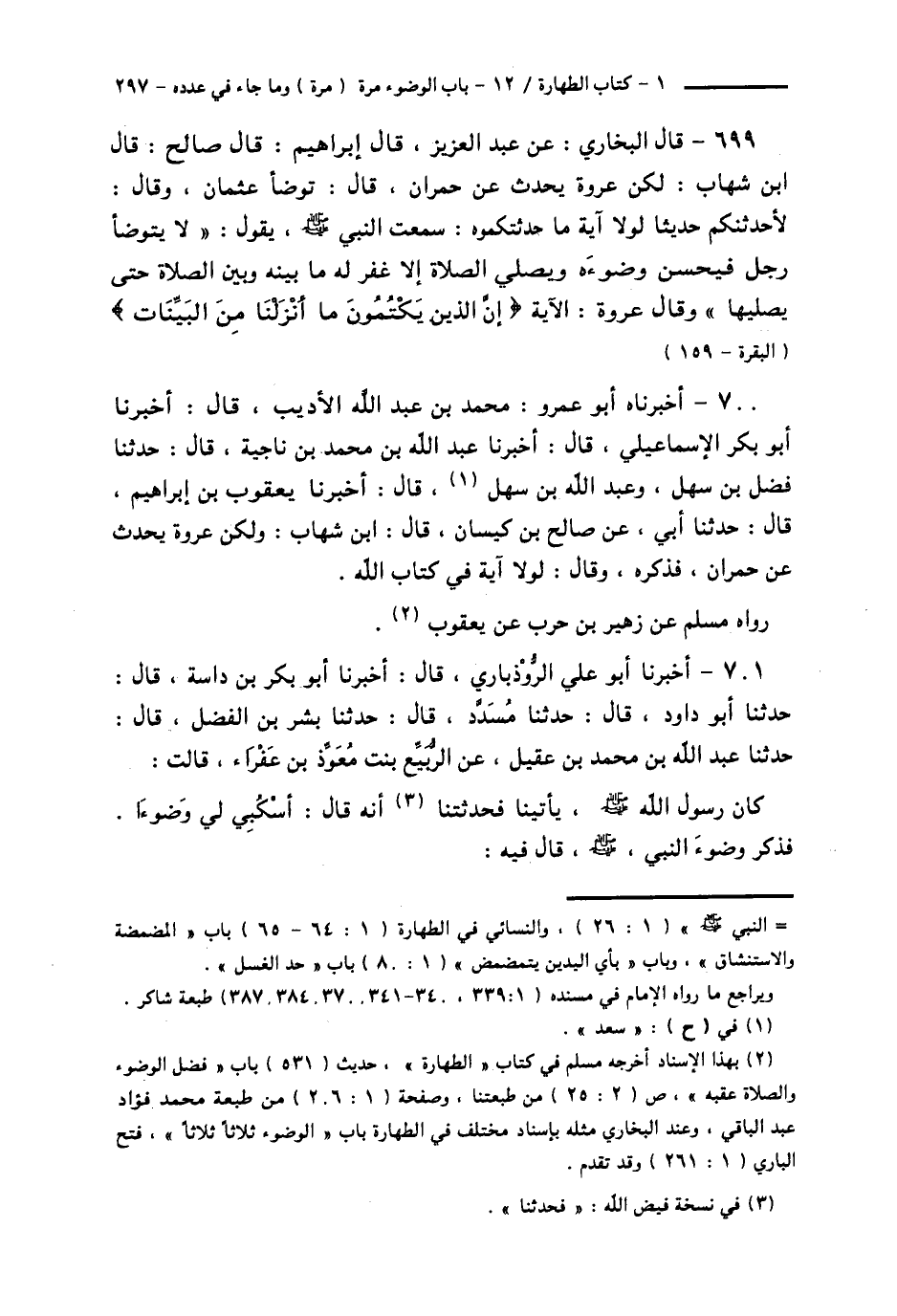 699 - قَالَ الْبُخَارِيُّ: عَنْ عَبْدِ الْعَزِيزِ، قَالَ إِبْرَاهِيمُ: قَالَ صَالِحٌ: قَالَ ابْنُ شِهَابٍ: لَكِنَّ عُرْوَةَ، يُحَدِّثُ، عَنْ حُمْرَانَ قَالَ: تَوَضَّأَ عُثْمَانُ، وَقَالَ: لَأُحَدِّثَنَّكُمْ حَدِيثًا لَوْلَا آيَةٌ مَا حَدَّثْتُكُمُوهُ، سَمِعْتُ النَّبِيَّ صَلَّى اللهُ عَلَيْهِ وَسَلَّمَ، يَقُولُ: § «لَا يَتَوَضَّأُ رَجُلٌ فَيُحْسِنُ وُضُوءَهُ وَيُصَلِّي الصَّلَاةَ إِلَّا غُفِرَ لَهُ مَا بَيْنَهُ وَبَيْنَ الصَّلَاةِ حَتَّى يُصَلِّيَهَا». وَقَالَ عُرْوَةُ: الْآيَةَ {إِنَّ الَّذِينَ يَكْتُمُونَ مَا أَنْزَلْنَا مِنَ الْبَيِّنَاتِ} [البقرة: 159].
