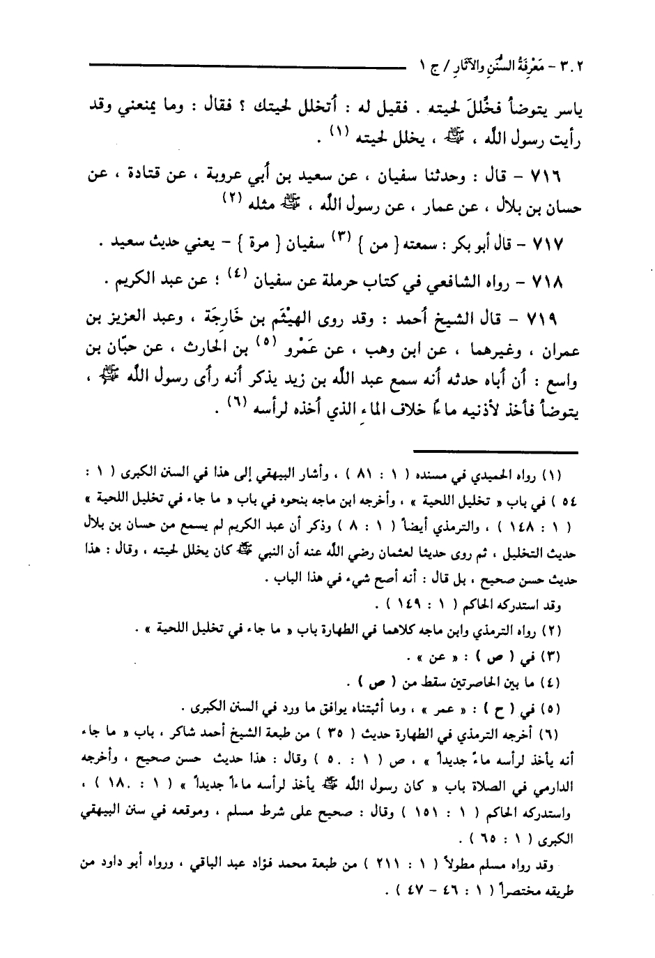 719 - قَالَ الشَّيْخُ أَحْمَدُ: وَقَدْ رَوَى الْهَيْثَمُ بْنُ خَارِجَةَ، وَعَبْدُ الْعَزِيزِ بْنُ عِمْرَانَ، وَغَيْرُهُمَا، عَنِ ابْنِ وَهْبٍ، عَنْ عَمْرِو بْنِ الْحَارِثِ، عَنْ حَبَّانَ بْنِ وَاسِعٍ، أَنَّ أَبَاهُ، حَدَّثَهُ أَنَّهُ سَمِعَ عَبْدَ اللَّهِ بْنَ زَيْدٍ، يَذْكُرُ: «أَنَّهُ رَأَى رَسُولَ اللَّهِ صَلَّى اللهُ عَلَيْهِ وَسَلَّمَ §يَتَوَضَّأُ فَأَخَذَ لِأُذُنَيْهِ مَاءً خِلَافَ الْمَاءِ الَّذِي أَخَذَهُ لِرَأْسِهِ»