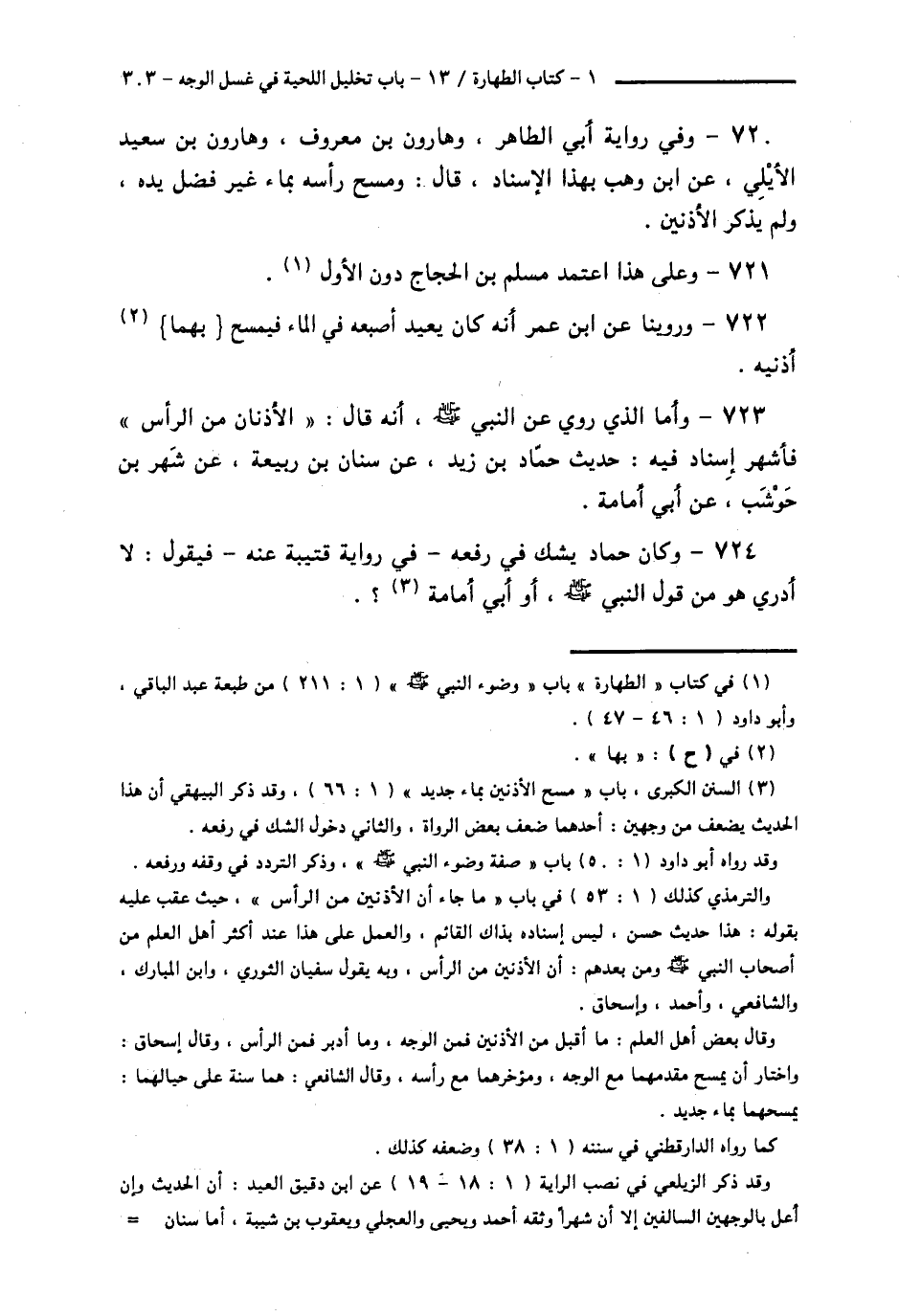 723 - وَأَمَّا الَّذِي رُوِيَ عَنِ النَّبِيِّ صَلَّى اللهُ عَلَيْهِ وَسَلَّمَ، أَنَّهُ قَالَ: «§الْأُذُنَانِ مِنَ الرَّأْسِ»، فَأَشْهَرُ إِسْنَادٍ فِيهِ: حَدِيثُ حَمَّادِ بْنِ زَيْدٍ، عَنْ سِنَانِ بْنِ رَبِيعَةَ، عَنْ شَهْرِ بْنِ حَوْشَبٍ، عَنْ أَبِي أُمَامَةَ