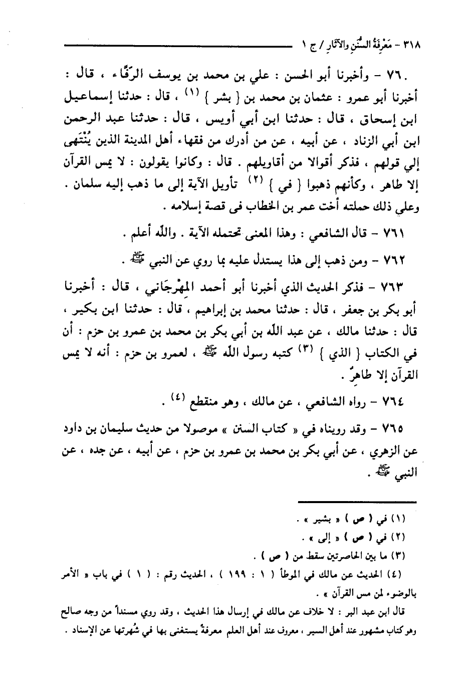 763 - فَذَكَرَ الْحَدِيثَ الَّذِي أَخْبَرَنَا أَبُو أَحْمَدَ الْمِهْرَجَانِيُّ قَالَ: أَخْبَرَنَا أَبُو بَكْرِ بْنُ جَعْفَرٍ قَالَ: حَدَّثَنَا مُحَمَّدُ بْنُ إِبْرَاهِيمَ قَالَ: حَدَّثَنَا ابْنُ بُكَيْرٍ قَالَ: حَدَّثَنَا مَالِكٌ، عَنْ عَبْدِ اللَّهِ بْنِ أَبِي بَكْرِ بْنِ مُحَمَّدِ بْنِ عَمْرِو بْنِ حَزْمٍ: أَنَّ فِي الْكِتَابِ الَّذِي كَتَبَهُ رَسُولُ اللَّهِ صَلَّى اللهُ عَلَيْهِ وَسَلَّمَ لِعَمْرِو بْنِ حَزْمٍ: «أَنَّهُ §لَا يَمَسُّ الْقُرْآنَ إِلَّا طَاهِرٌ»،