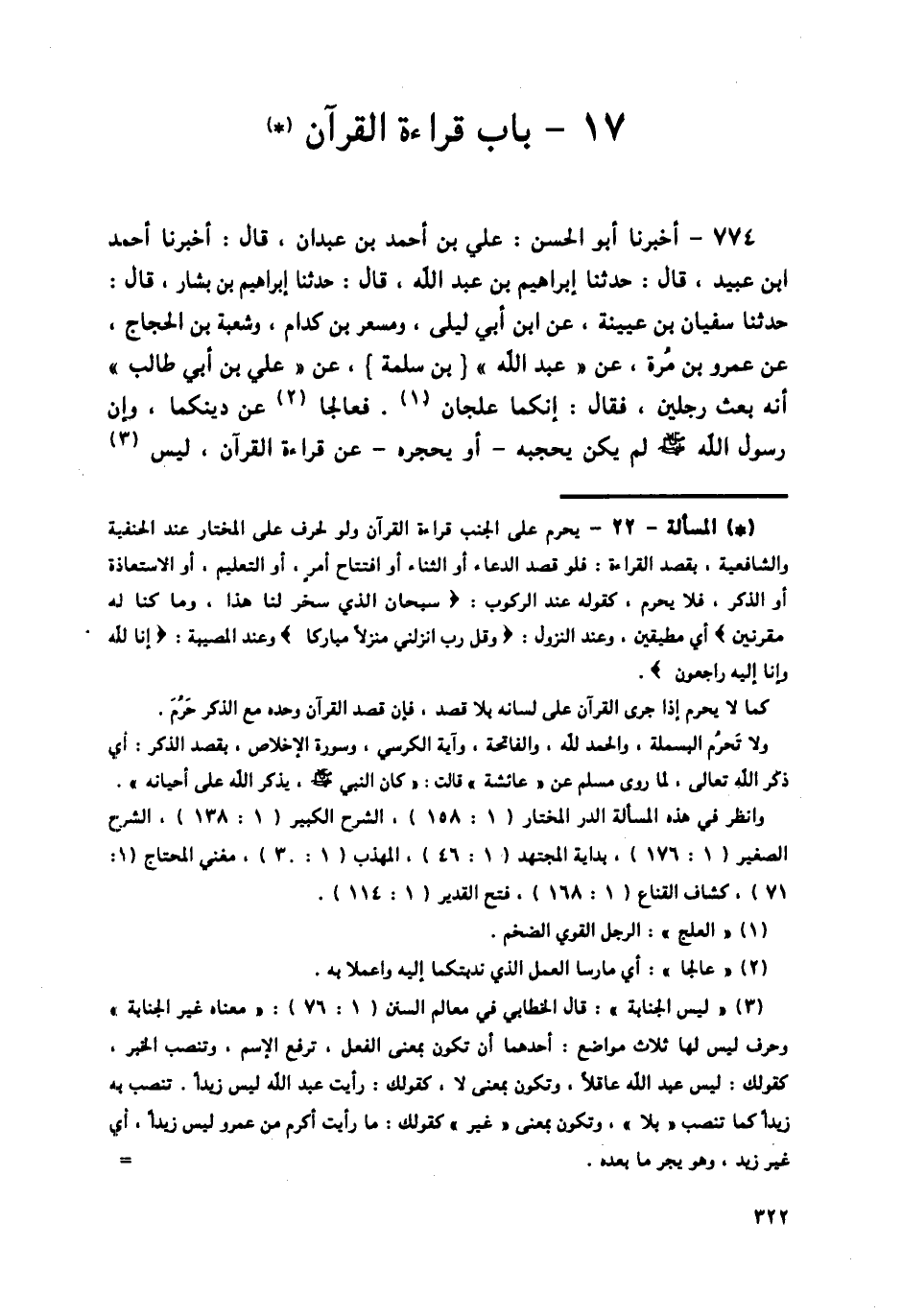 774 - أَخْبَرَنَا أَبُو الْحَسَنِ عَلِيُّ بْنُ أَحْمَدَ بْنِ عَبْدَانَ قَالَ: أَخْبَرَنَا أَحْمَدُ بْنُ عُبَيْدٍ قَالَ: حَدَّثَنَا إِبْرَاهِيمُ بْنُ عَبْدِ اللَّهِ قَالَ: حَدَّثَنَا إِبْرَاهِيمُ بْنُ بَشَّارٍ قَالَ: حَدَّثَنَا سُفْيَانُ بْنُ عُيَيْنَةَ، عَنِ ابْنِ أَبِي لَيْلَى، وَمِسْعَرِ بْنِ كِدَامٍ، وَشُعْبَةَ بْنِ الْحَجَّاجِ، عَنْ عَمْرِو بْنِ مُرَّةٍ، عَنْ عَبْدِ اللَّهِ بْنِ سَلَمَةَ، عَنْ عَلِيِّ بْنِ أَبِي طَالِبٍ، أَنَّهُ بَعَثَ رَجُلَيْنٍ، فَقَالَ: «إِنَّكُمَا عَلْجَانِ. فَعَالِجَا عَنْ دِينِكُمَا، وَإِنَّ رَسُولَ اللَّهِ صَلَّى اللهُ عَلَيْهِ وَسَلَّمَ §لَمْ يَكُنْ يَحْجُبُهُ أَوْ يَحْجُرُهُ عَنْ قِرَاءَةِ الْقُرْآنِ، لَيْسَ -[323]- الْجَنَابَةَ»