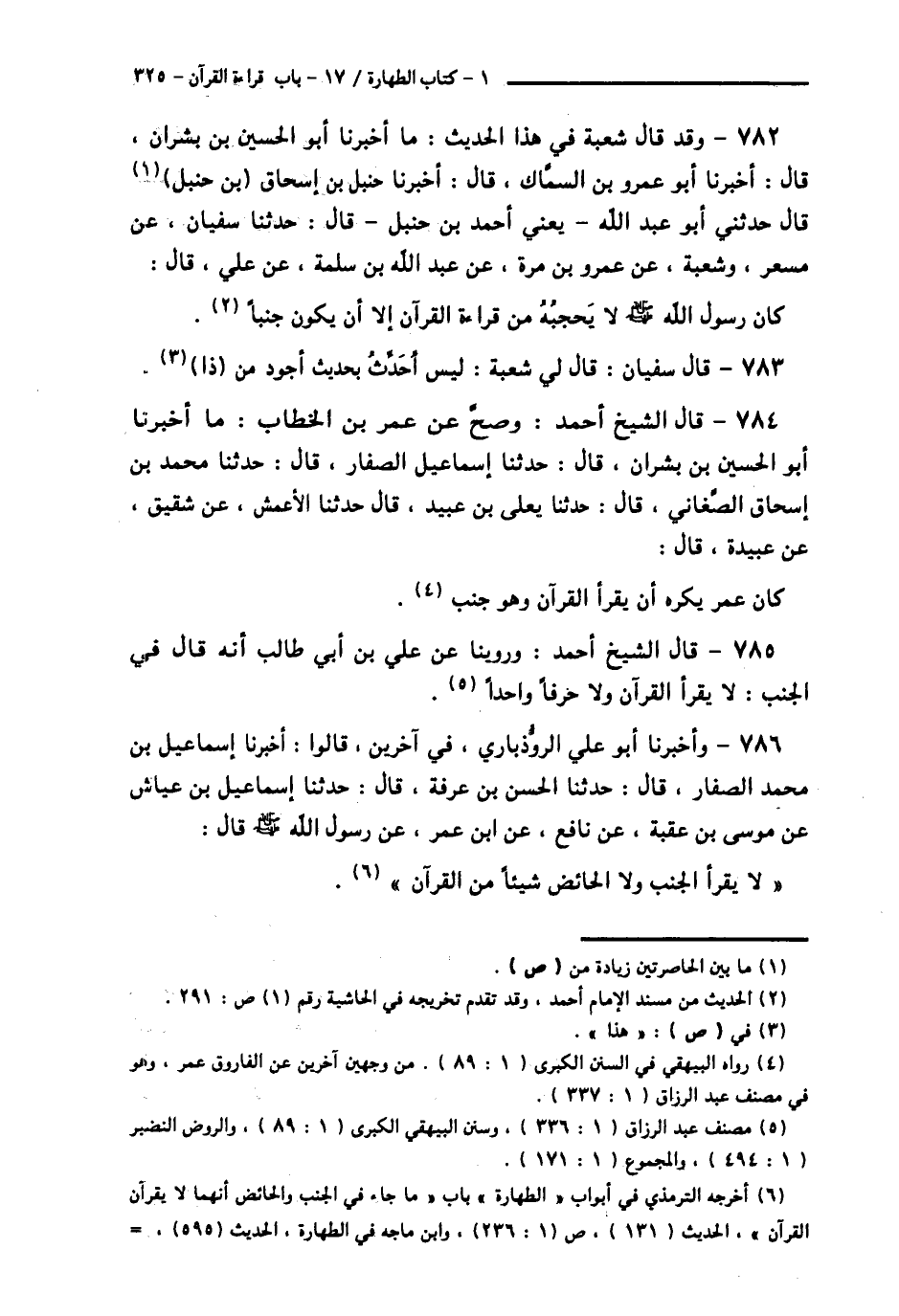 784 - قَالَ الشَّيْخُ أَحْمَدُ: وَصَحَّ عَنْ عُمَرَ بْنِ الْخَطَّابِ، مَا أَخْبَرَنَا أَبُو الْحُسَيْنِ بْنُ بِشْرَانَ قَالَ: حَدَّثَنَا إِسْمَاعِيلُ الصَّفَّارُ قَالَ: حَدَّثَنَا مُحَمَّدُ بْنُ إِسْحَاقَ الصَّغَانِيُّ قَالَ: حَدَّثَنَا يَعْلَى بْنُ عُبَيْدٍ قَالَ: حَدَّثَنَا الْأَعْمَشُ، عَنْ شَقِيقٍ، عَنْ عُبَيْدَةَ قَالَ: «كَانَ عُمَرُ §يَكْرَهُ أَنْ يَقْرَأَ الْقُرْآنَ وَهُوَ جُنُبٌ»