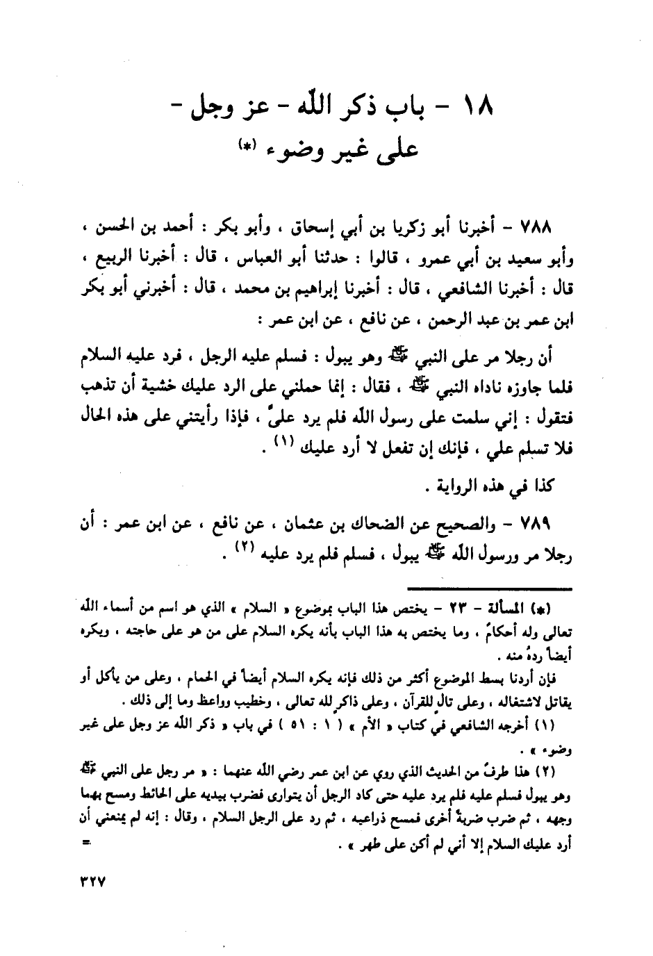 788 - أَخْبَرَنَا أَبُو زَكَرِيَّا بْنُ أَبِي إِسْحَاقَ، وَأَبُو بَكْرٍ أَحْمَدُ بْنُ الْحَسَنِ، وَأَبُو سَعِيدِ بْنُ أَبِي عَمْرٍو، قَالُوا: حَدَّثَنَا أَبُو الْعَبَّاسِ قَالَ: أَخْبَرَنَا الرَّبِيعُ قَالَ: أَخْبَرَنَا الشَّافِعِيُّ قَالَ: أَخْبَرَنَا إِبْرَاهِيمُ بْنُ مُحَمَّدٍ قَالَ: أَخْبَرَنِي أَبُو بَكْرِ بْنُ عُمَرَ بْنِ عَبْدِ الرَّحْمَنِ، عَنْ نَافِعٍ، عَنِ ابْنِ عُمَرَ، أَنَّ رَجُلًا مَرَّ عَلَى النَّبِيِّ صَلَّى اللهُ عَلَيْهِ وَسَلَّمَ، وَهُوَ يَبُولُ: فَسَلَّمَ عَلَيْهٍ الرَّجُلُ، فَرَدَّ عَلَيْهِ السَّلَامَ فَلَمَّا جَاوَزَهُ نَادَاهُ النَّبِيُّ صَلَّى اللهُ عَلَيْهِ وَسَلَّمَ، فَقَالَ: " إِنَّمَا §حَمَلَنِي عَلَى الرَّدِّ عَلَيْكَ خَشْيَةَ أَنْ تَذْهَبَ فَتَقُولَ: إِنِّي سَلَّمْتُ عَلَى رَسُولِ اللَّهِ فَلَمْ يَرُدَّ عَلَى، فَإِذَا رَأَيْتَنِي عَلَى هَذِهِ الْحَالِ فَلَا تُسَلِّمْ عَلَيَّ، فَإِنَّكَ إِنْ تَفْعَلْ لَا أَرُدُّ عَلَيْكَ ". كَذَا فِي هَذِهِ الرِّوَايَةِ