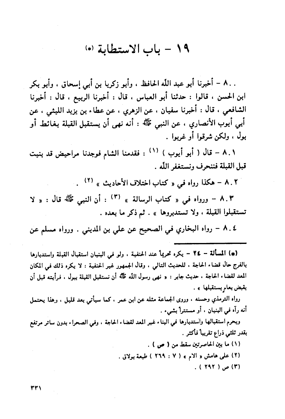 804 - رَوَاهُ الْبُخَارِيُّ فِي الصَّحِيحِ، عَنْ عَلِيِّ بْنِ الْمَدِينِيِّ. وَرَوَاهُ مُسْلِمٌ، عَنْ -[332]- يَحْيَى بْنِ يَحْيَى، وَغَيْرِهِ. كُلُّهُمْ، عَنْ سُفْيَانَ بْنِ عُيَيْنَةَ وَقَالَ فِي لَفْظِهِ: «إِذَا أَتَيْتُمُ الْغَائِطَ، فَلَا تَسْتَقْبِلُوا الْقِبْلَةَ، وَلَا تَسْتَدْبِرُوهَا بِبَوْلٍ وَلَا غَائِطٍ»