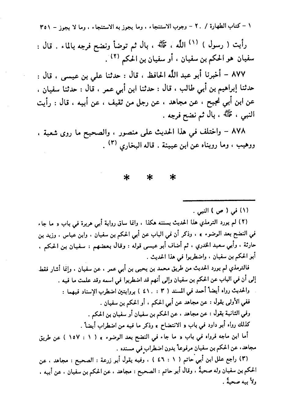 877 - أَخْبَرَنَا أَبُو عَبْدِ اللَّهِ الْحَافِظُ قَالَ: حَدَّثَنَا عَلِيُّ بْنُ عِيسَى قَالَ: حَدَّثَنَا إِبْرَاهِيمُ بْنُ أَبِي طَالِبٍ قَالَ: حَدَّثَنَا ابْنُ أَبِي عُمَرَ قَالَ: حَدَّثَنَا سُفْيَانُ، عَنِ ابْنِ أَبِي نَجِيحٍ، عَنْ مُجَاهِدٍ، عَنْ رَجُلٍ، مِنْ ثَقِيفٍ، عَنْ أَبِيهِ قَالَ: رَأَيْتُ النَّبِيَّ صَلَّى اللهُ عَلَيْهِ وَسَلَّمَ، §بَالَ ثُمَّ نَضَحَ فَرْجَهُ "،