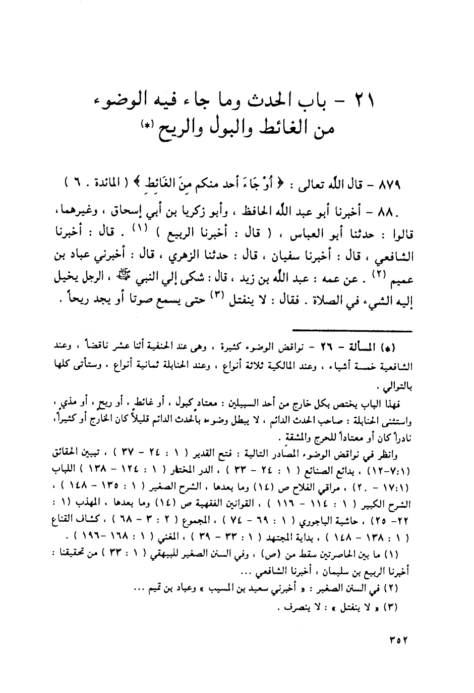 880 - أَخْبَرَنَا أَبُو عَبْدِ اللَّهِ الْحَافِظُ، وَأَبُو زَكَرِيَّا بْنُ أَبِي إِسْحَاقَ، وَغَيْرُهُمَا، قَالُوا: حَدَّثَنَا أَبُو الْعَبَّاسِ قَالَ: أَخْبَرَنَا الرَّبِيعُ قَالَ: أَخْبَرَنَا الشَّافِعِيُّ قَالَ: أَخْبَرَنَا سُفْيَانُ قَالَ: حَدَّثَنَا الزُّهْرِيُّ قَالَ: أَخْبَرَنِي عَبَّادُ بْنُ تَمِيمٍ، عَنْ عَمِّهِ عَبْدِ اللَّهِ بْنِ زَيْدٍ قَالَ: شُكِيَ إِلَى النَّبِيِّ صَلَّى اللهُ عَلَيْهِ وَسَلَّمَ، الرَّجُلُ يُخَيَّلُ إِلَيْهِ الشَّيْءُ فِي الصَّلَاةِ. فَقَالَ: «§لَا يَنْفَتِلُ حَتَّى يَسْمَعَ صَوْتًا أَوْ يَجِدَ رِيحًا» -[353]-، رَوَاهُ الْبُخَارِيُّ فِي الصَّحِيحِ، عَنْ عَلِيِّ بْنِ الْمَدِينِيِّ، وَغَيْرِهِ. وَرَوَاهُ مُسْلِمٌ، عَنْ عَمْرٍو النَّاقِدِ، وَغَيْرِهِ. كُلُّهُمْ عَنْ سُفْيَانَ بْنِ عُيَيْنَةَ
