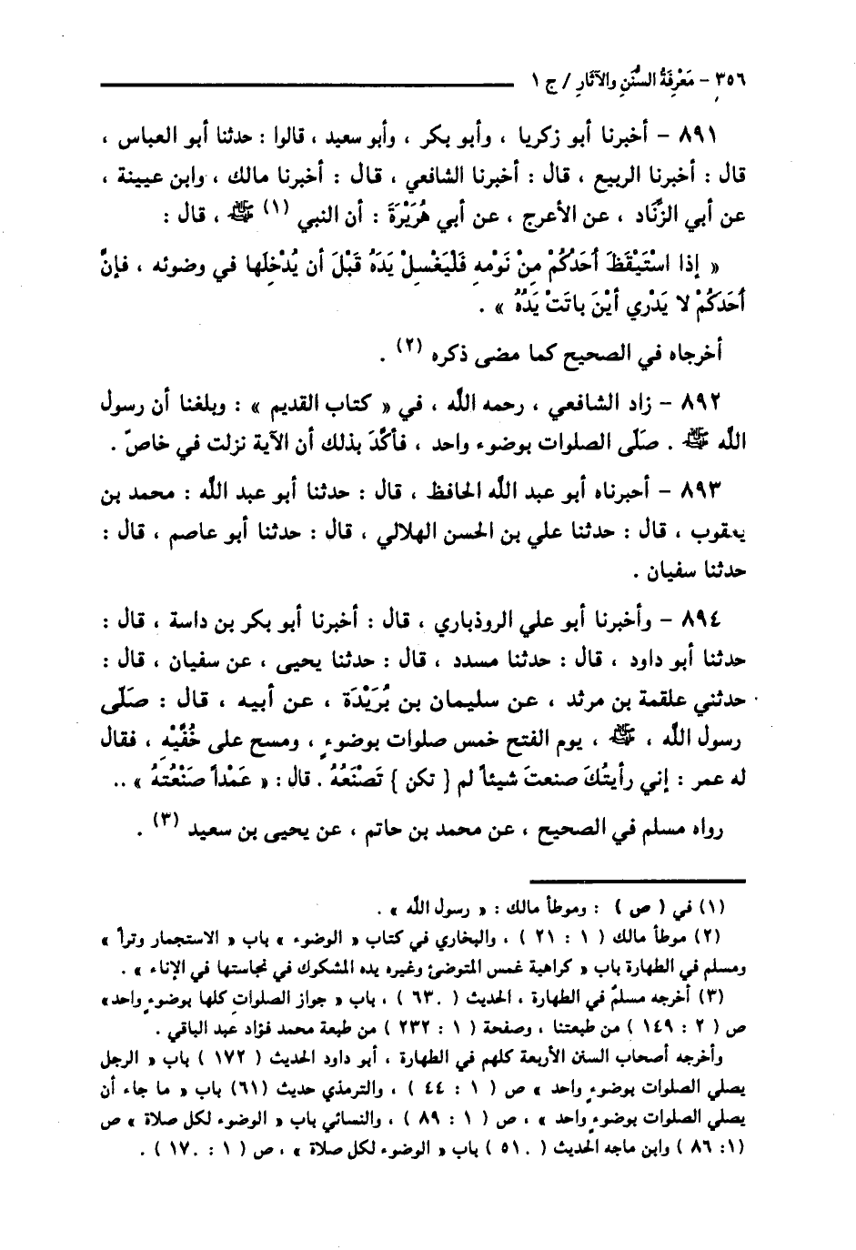 891 - أَخْبَرَنَا أَبُو زَكَرِيَّا، وَأَبُو بَكْرٍ، وَأَبُو سَعِيدٍ، قَالُوا: حَدَّثَنَا أَبُو الْعَبَّاسِ قَالَ: أَخْبَرَنَا الرَّبِيعُ قَالَ: أَخْبَرَنَا الشَّافِعِيُّ قَالَ: أَخْبَرَنَا مَالِكٌ، وَابْنُ عُيَيْنَةَ، عَنْ أَبِي الزِّنَادِ، عَنِ الْأَعْرَجِ، عَنْ أَبِي هُرَيْرَةَ، أَنَّ النَّبِيَّ صَلَّى اللهُ عَلَيْهِ وَسَلَّمَ قَالَ: § «إِذَا اسْتَيْقَظَ أَحَدُكُمْ مِنْ نَوْمِهِ فَلْيَغْسِلْ يَدَهُ قَبْلَ أَنْ يُدْخِلَهَا فِي وَضُوئِهِ، فَإِنَّ أَحَدَكُمْ لَا يَدْرِي أَيْنَ بَاتَتْ يَدُهُ» أَخْرَجَاهُ فِي الصَّحِيحِ كَمَا مَضَى ذِكْرُهُ