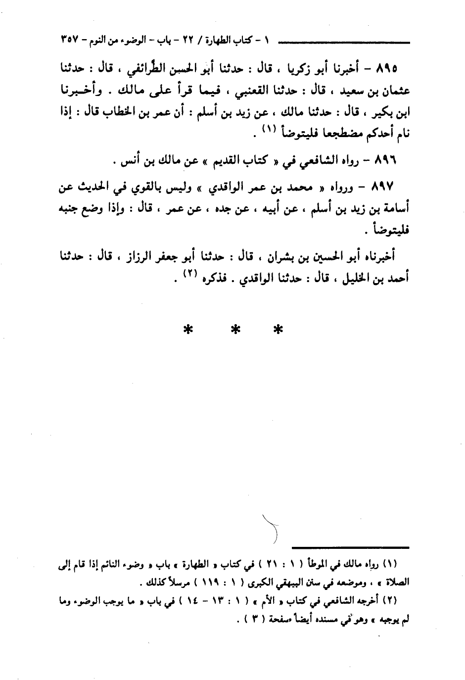 895 - أَخْبَرَنَا أَبُو زَكَرِيَّا قَالَ: حَدَّثَنَا أَبُو الْحَسَنِ الطَّرَائِفِيُّ قَالَ: حَدَّثَنَا عُثْمَانُ بْنُ سَعِيدٍ قَالَ: حَدَّثَنَا الْقَعْنَبِيُّ، فِيمَا قَرَأَ عَلَى مَالِكٍ. وَأَخْبَرَنَا ابْنُ بُكَيْرٍ قَالَ: حَدَّثَنَا مَالِكٌ، عَنْ زَيْدِ بْنِ أَسْلَمَ: أَنَّ عُمَرَ بْنَ الْخَطَّابِ قَالَ: «§إِذَا نَامَ أَحَدُكُمْ مُضْطَجِعًا فَلْيَتَوَضَّأْ»،