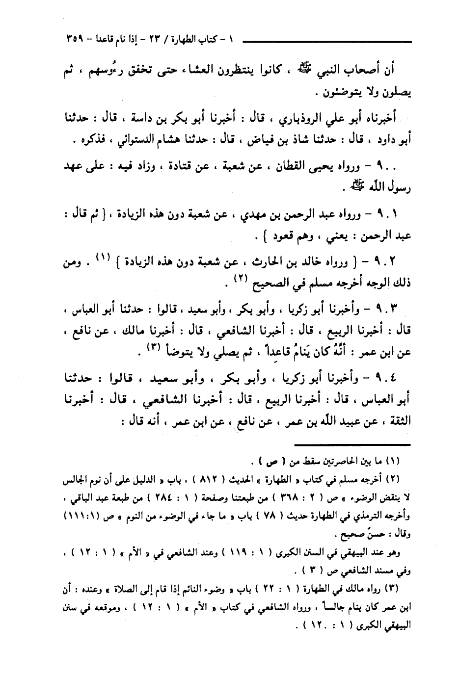 905 - قَالَ الشَّافِعِيُّ فِي كِتَابِ اخْتِلَافِهِ، وَمَالِكٍ ": إِنْكَارًا لِفَرْقِهِمْ بَيْنَ قَلِيلِ النَّوْمِ وَكَثِيرِهِ: قَوْلُ ابْنِ عُمَرَ كَمَا حَكَى مَالِكٌ، فَهُوَ لَا يَرَى فِي النَّوْمِ قَاعِدًا وُضُوءًا