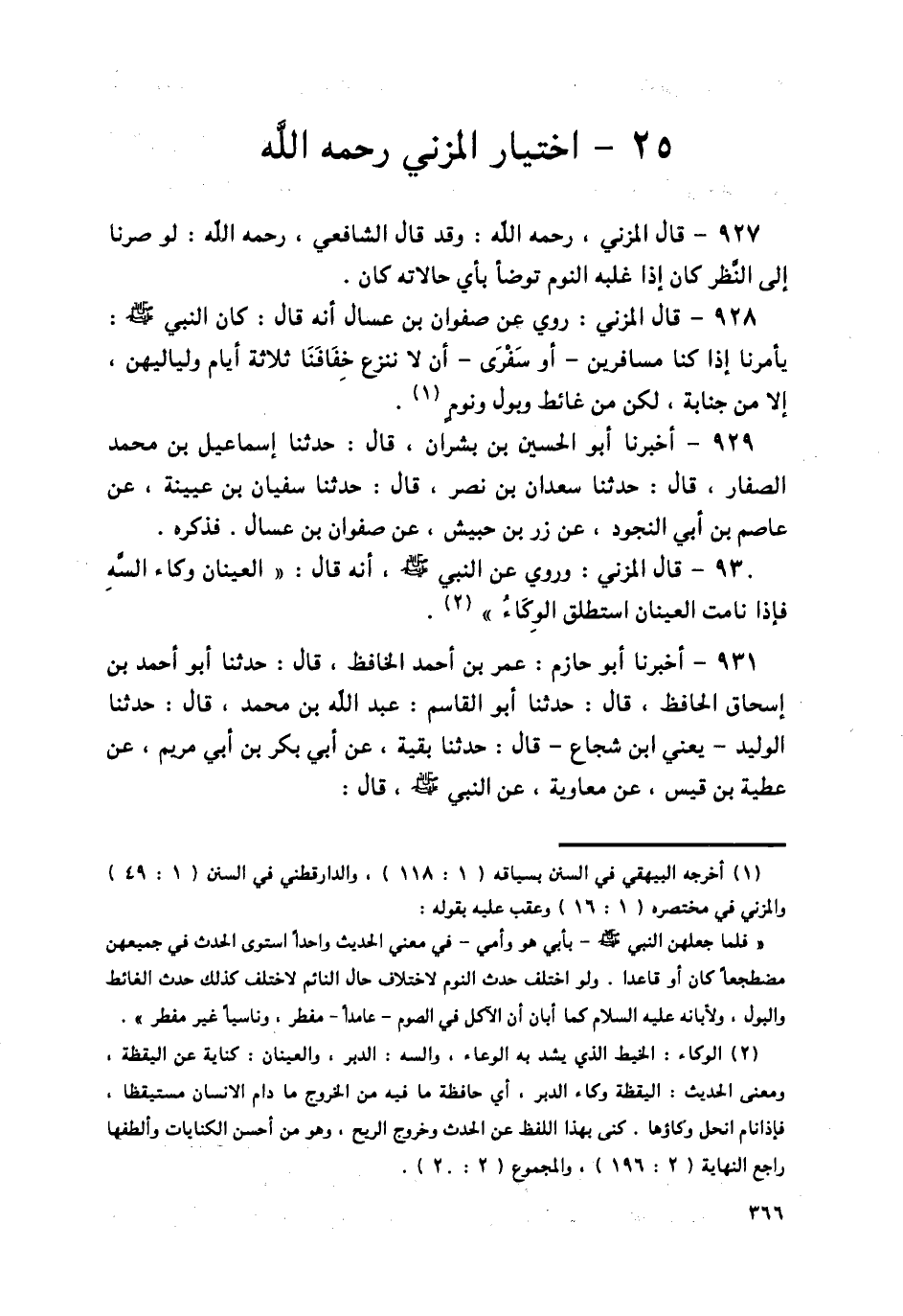 928 - قَالَ الْمُزَنِيُّ: رُوِيَ عَنْ صَفْوَانَ بْنِ عَسَّالٍ، أَنَّهُ قَالَ: " كَانَ النَّبِيُّ صَلَّى اللهُ عَلَيْهِ وَسَلَّمَ: §يَأْمُرُنَا إِذَا كُنَّا مُسَافِرِينَ أَوْ سَفْرَى أَنْ لَا نَنْزِعَ خِفَافَنَا ثَلَاثَةَ أَيَّامٍ وَلَيَالِيهِنَّ، إِلَّا مِنْ جَنَابَةٍ، لَكِنْ مِنْ غَائِطٍ وَبَوْلٍ وَنَوْمٍ "