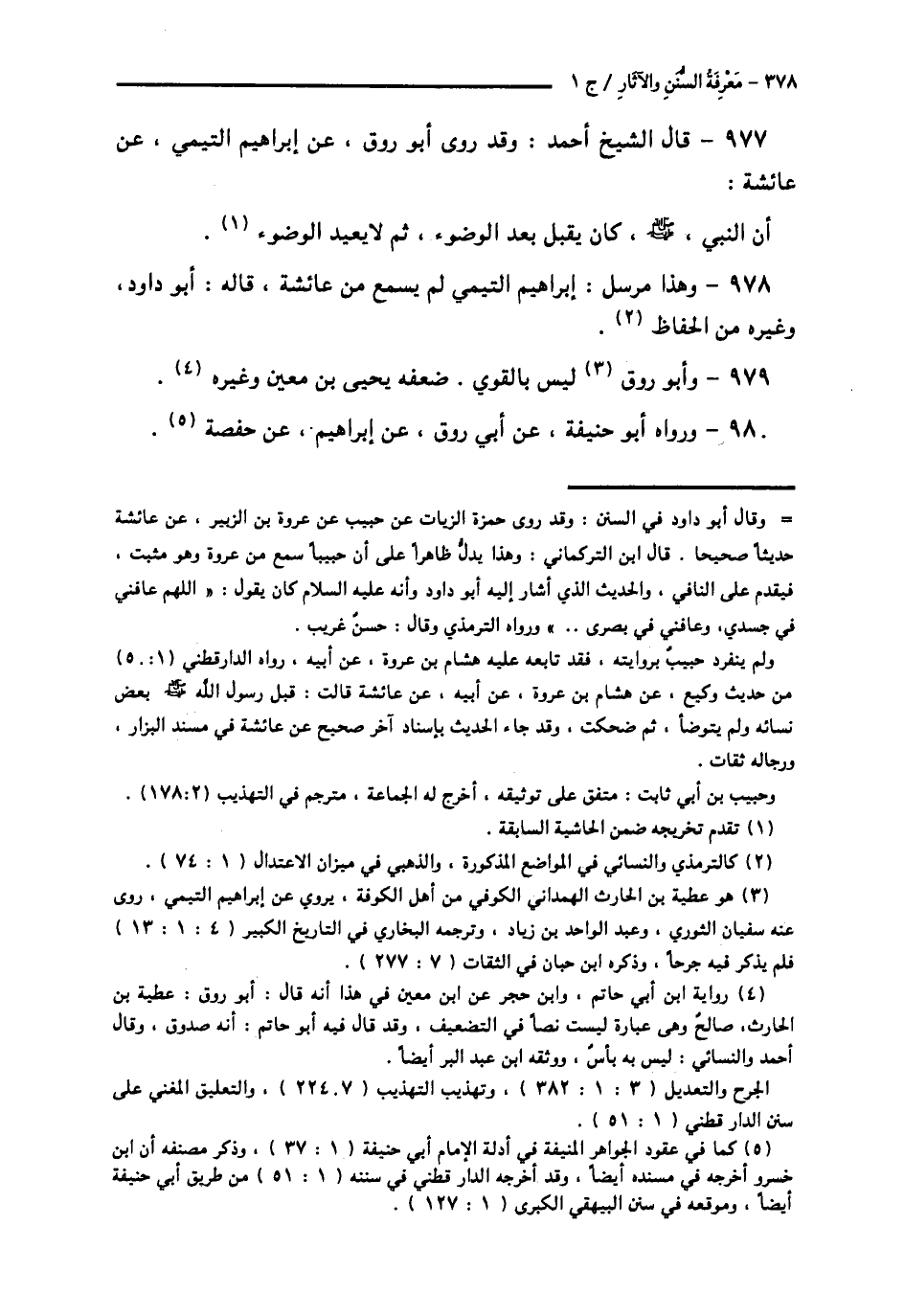 977 - قَالَ الشَّيْخُ أَحْمَدُ: وَقَدْ رَوَى أَبُو رَوْقٍ، عَنْ إِبْرَاهِيمَ التَّيْمِيِّ، عَنْ عَائِشَةَ: «أَنَّ النَّبِيَّ صَلَّى اللهُ عَلَيْهِ وَسَلَّمَ كَانَ §يُقَبِّلُ بَعْدَ الْوُضُوءِ، ثُمَّ لَا يُعِيدُ الْوُضُوءَ»